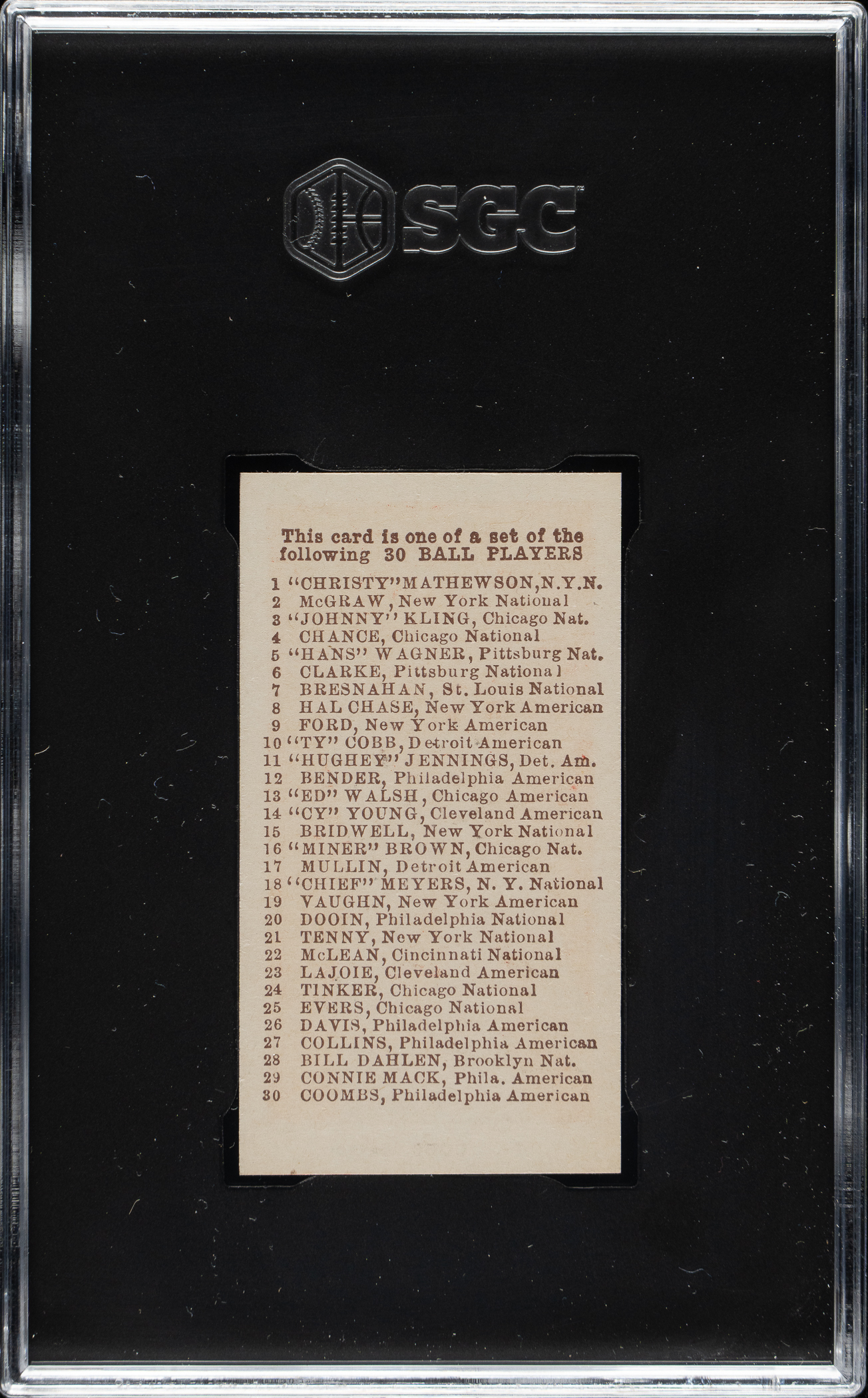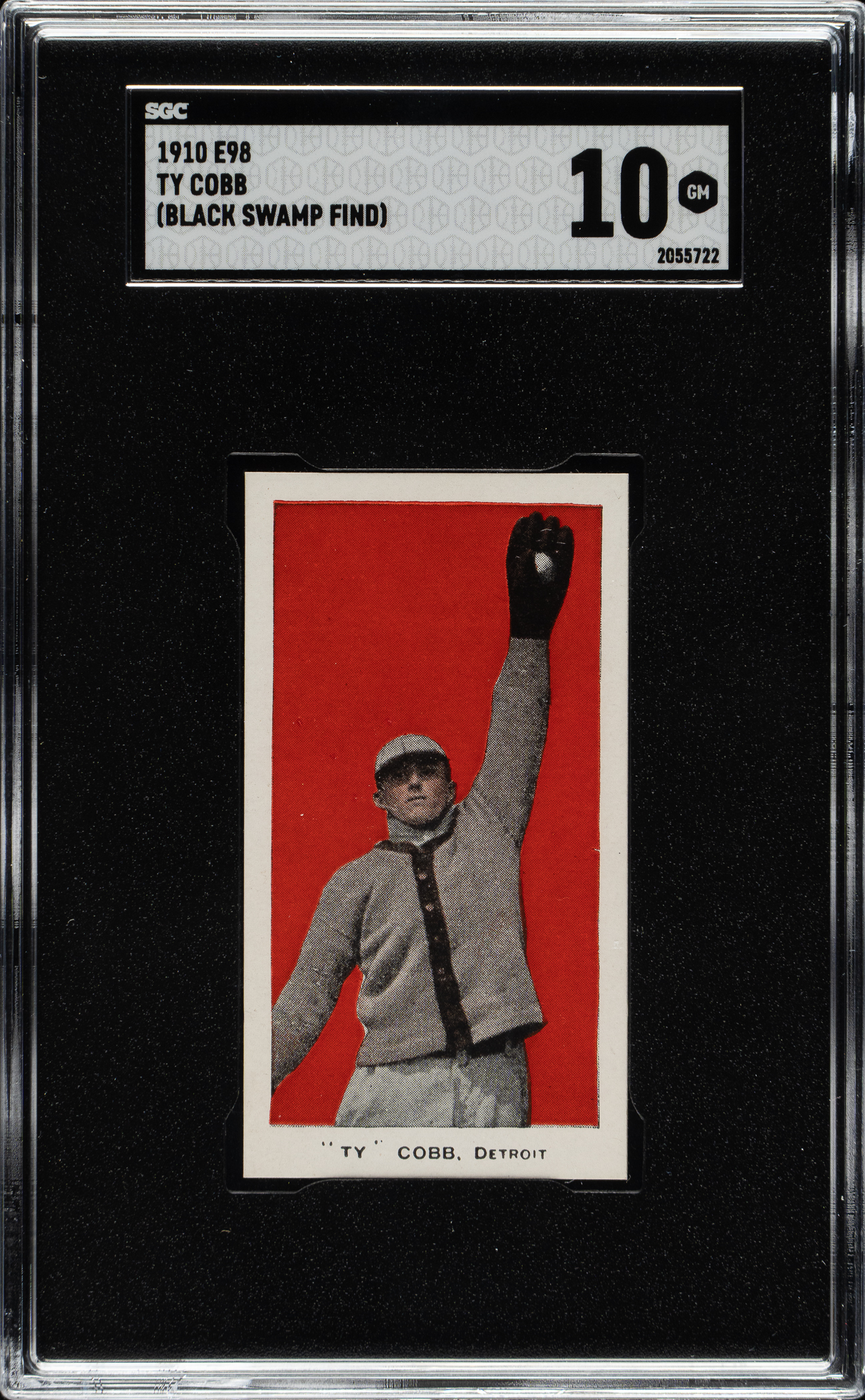 Graded GEM MINT 10 by SGC. One of only two examples graded at this tremendous level! Presented is an exceptional ultra-high-grade example of Detroit Tigers Hall of Famer Ty Cobb from the E98 “Set of 30” candy-card issue. The manufacturer of E98 is unknown, and the set might be easily confused with other caramel-card sets of the era (E93 and E94 specifically). E98 is an entirely different set even though it uses many of the same subjects and poses. For many years, E98s were among the scarcest of the 1910-era caramel cards, but the recent “Black Swamp Find” (from which this card originates) has changed the population dramatically. E98s have always been very desirable, and their increased availability and noteworthiness because of the find might have actually increased demand as more collectors have become familiar with the set. This card is perfectly preserved with outstanding color, an extremely bold red background, superb centering, flawless registration, and four sharp corners. The reverse is perfectly clean and boldly printed. As expected, this card has outstanding eye appeal! Caramel cards in general are much rarer than tobacco cards of the era. Because they were issued with caramels one card per package and sold to children (as opposed to being sold to adults with tobacco), they also tend to survive in a much lower grade, making these high-grade "Black Swamp Find" cards of all the greater note. A superb ultra-high-grade E98 example of the legendary Ty Cobb, one of the key cards from this rare and desirable early twentieth-century candy issue, with the special distinction of originating from the famous "Black Swamp Find.
