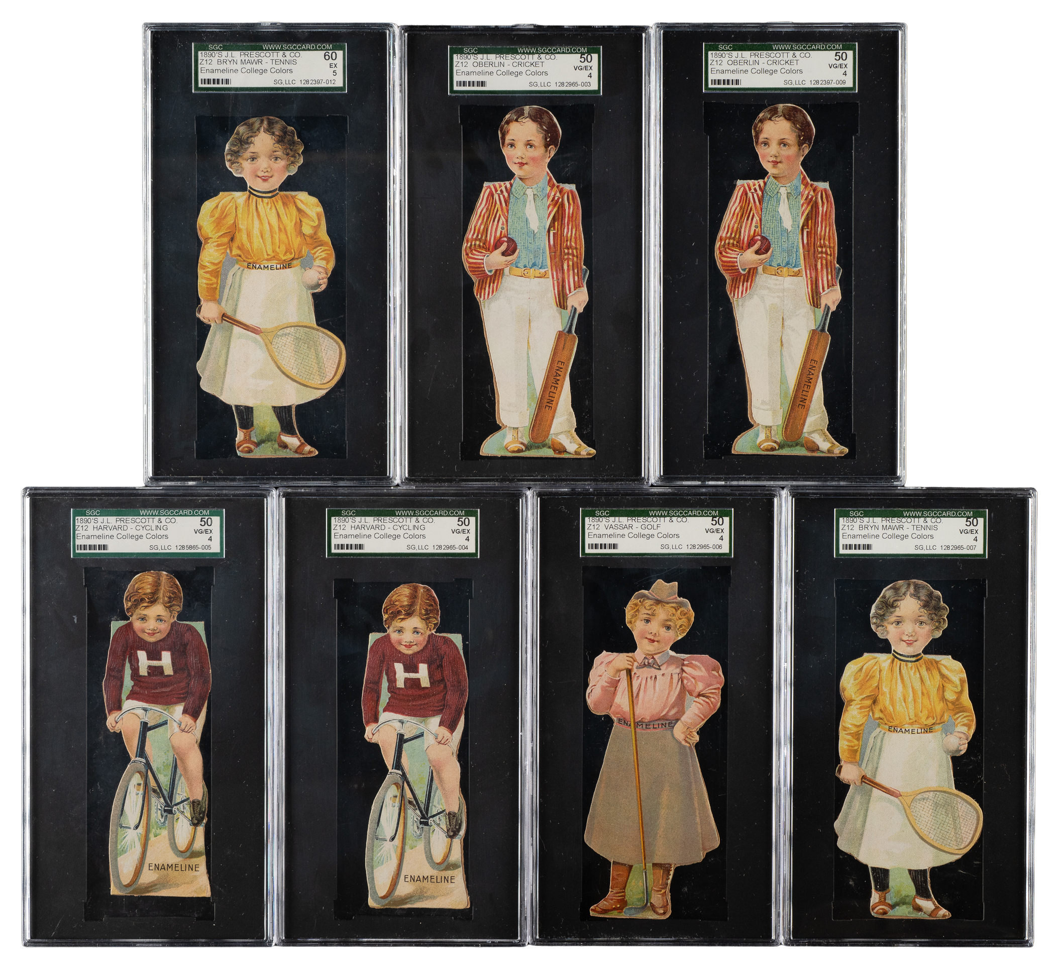 Collection of thirteen Circa 1890s Enameline Die-Cut Advertising Stand-Ups, each graded and encapsulated by SGC. SGC Grading Composite: EX 60 (7 cards): Baseball, Croquet, Cycling, Football, Golf, Rowing, and Tennis. VG/EX 50 (6 cards): Two Cricket, two Cycling, Golf, and Tennis. Total: 13 cards. The size/weight of this item requires that there will be an additional shipping charge for this lot.