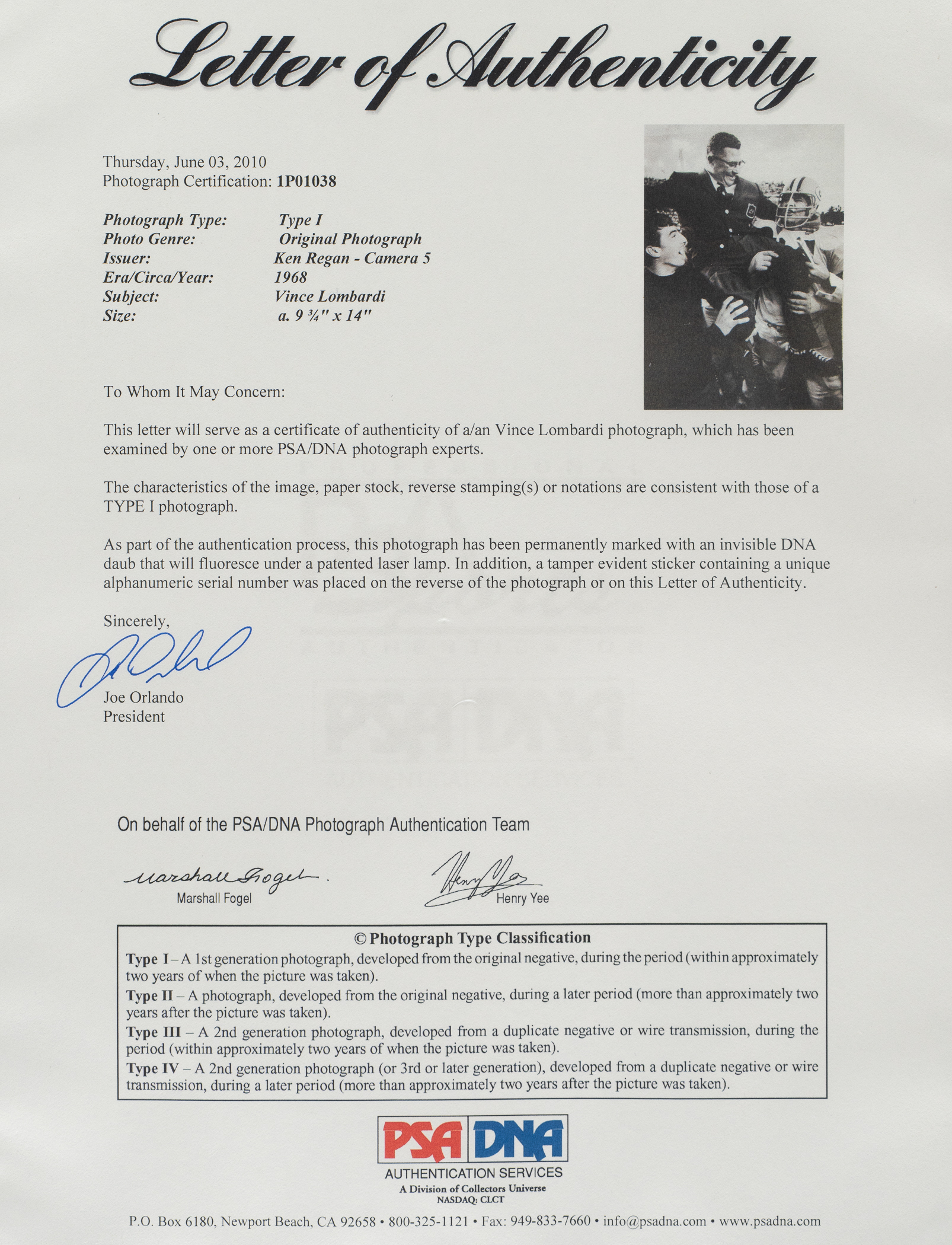 Green Bay Packers football Hall of Famer Vince Lombardi. Certified as an original Type I photograph by PSA/DNA. Total dimensions: 9-3/4 x 14 Inches.