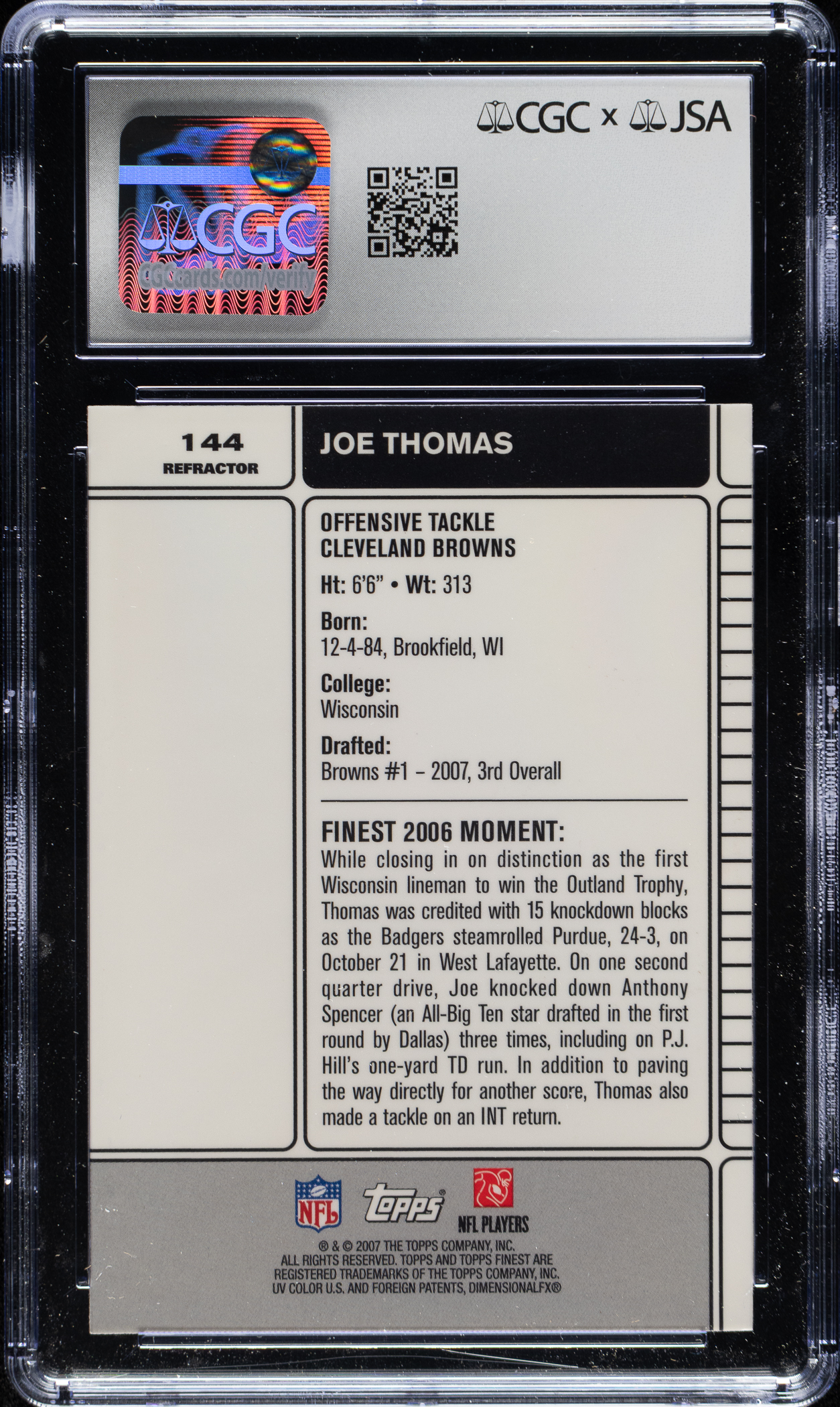 CGC/JSA has encapsulated the card, grading the signature GEM MINT 10. Cleveland Browns football Hall of Famer Joe Thomas.