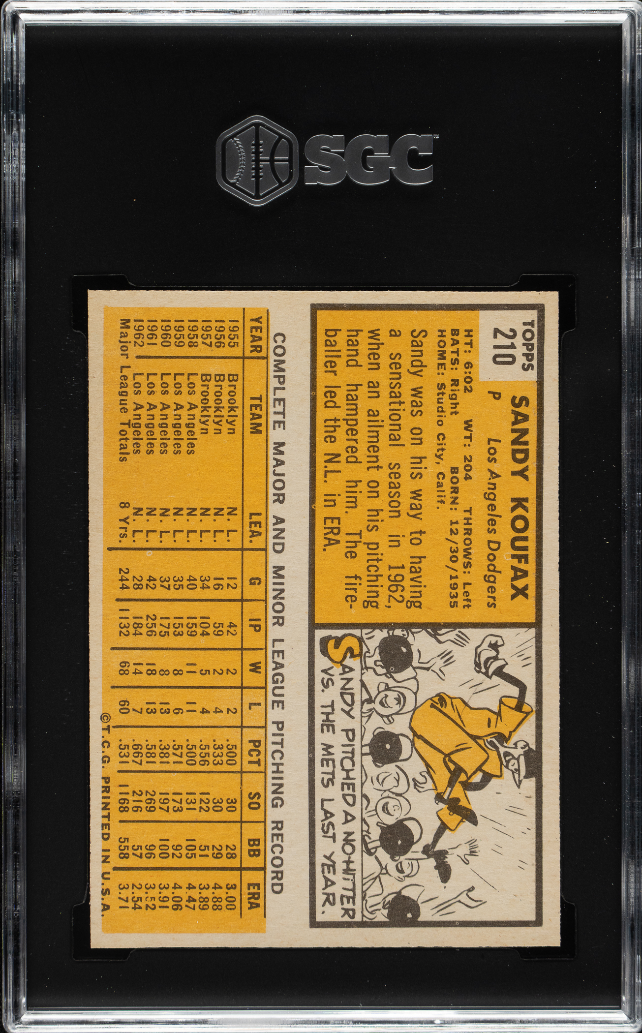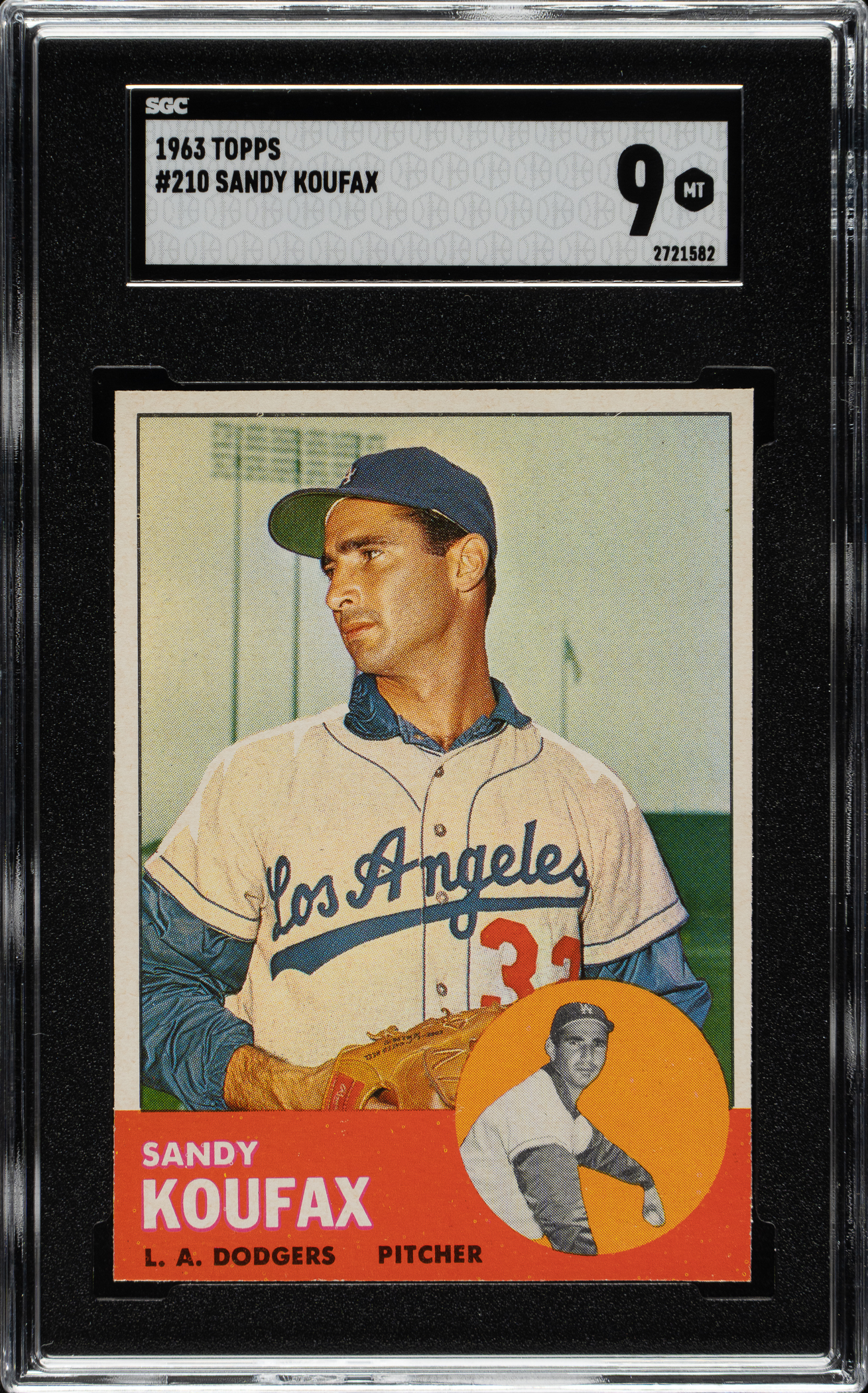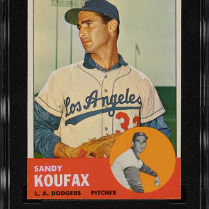 Graded MINT 9 by SGC. One of only four examples graded at this level by SGC with none higher! Stunning ultra high-grade example of Los Angeles Dodgers Hall of Famer Sandy Koufax from the 1963 Topps set. The offered card features a superb image, strong corners, and excellent centering. This is one of Koufax’s most desirable cards dating from his MVP season, in which he posted a 25-5 record with a league-leading 306 strikeouts and 1.88 ERA. A stunning example worthy of any high-quality 1963 Topps set, Sandy Koufax, or Hall of Fame card collection.