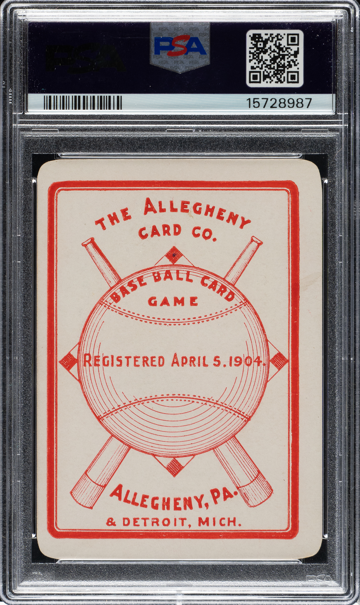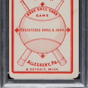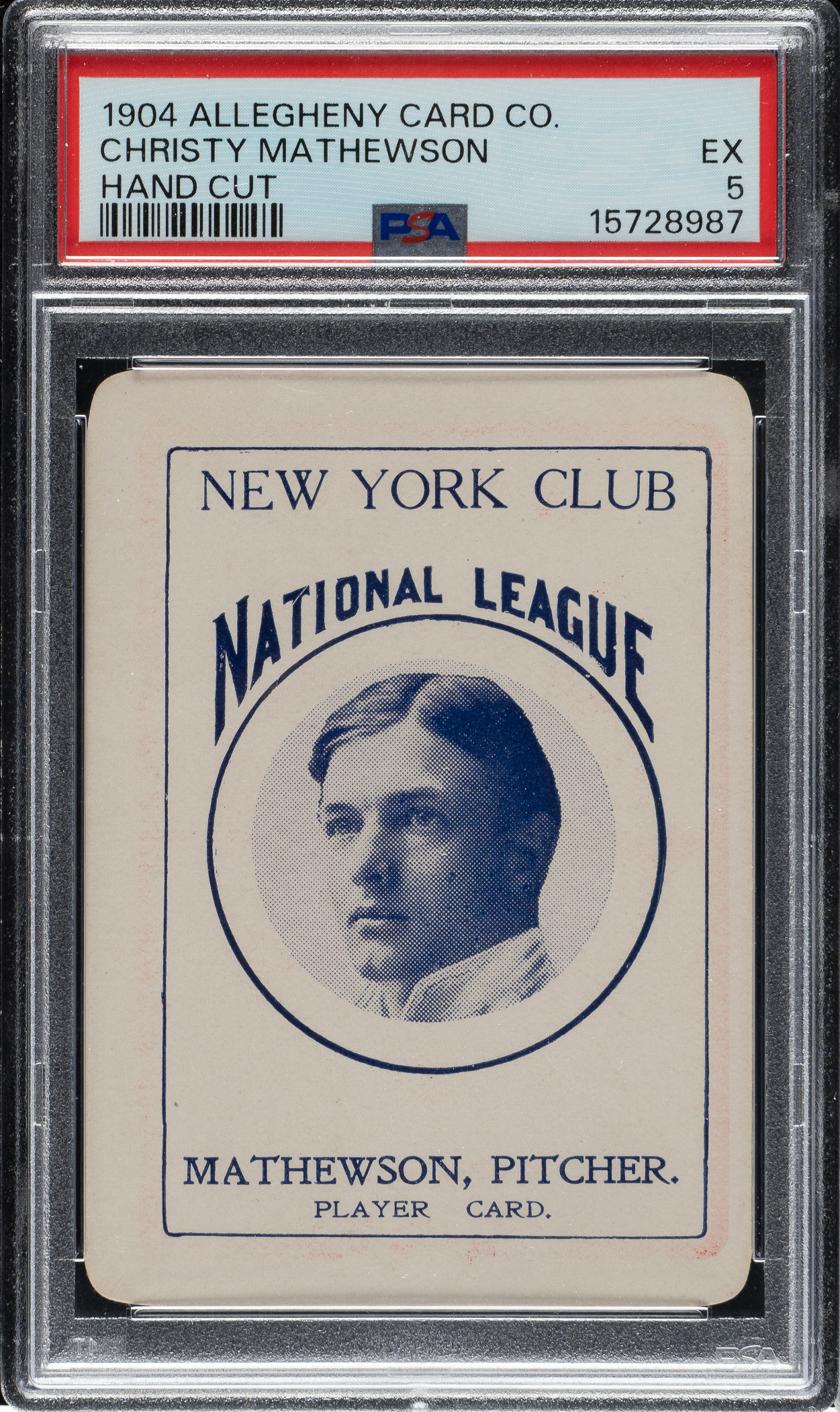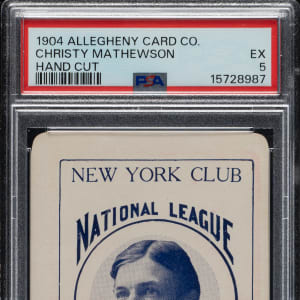 Graded EX 5 by PSA. This is an extraordinary rarity! Extremely rare sample card from the legendary Allegheny Card Company set of 1904, featuring New York Giants young star pitcher, Christy Mathewson. This is one of the key cards in the set and is one of Mathewson's earliest cards. It is also his rarest. To date, the only known Allegheny Card Co. set is the one sold in the auction of the famous Copeland Collection. (Copeland purchased that set, then housed in its original box, from REA in 1990.) The set was eventually broken up and dispersed to the four corners of the collecting world. There has yet to be a single additional card from this series to ever surface. This extraordinary example of Christy Mathewson, of course, originates from the Copeland set, and as is the case with all Allegheny cards, may very well be unique. (It is important to note that the PSA Population Report lists a PSA 6, which REA sold in 2008, but the offered card is one in the same with the PSA 6 as it was obviously regraded sometime in the last 18 years.) The set is of special interest to collectors, not just because of its extreme rarity, but also because it is one of the very few sets of baseball cards produced during the first few years of the century. The Allegheny card set offers a unique blend of players from the pre-1900 and post-1900 eras, including many players who appear in few (if any) other sets. This is an exceptional example of future Hall of Famer Christy Mathewson from one of prewar card collecting's rarest sets!