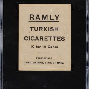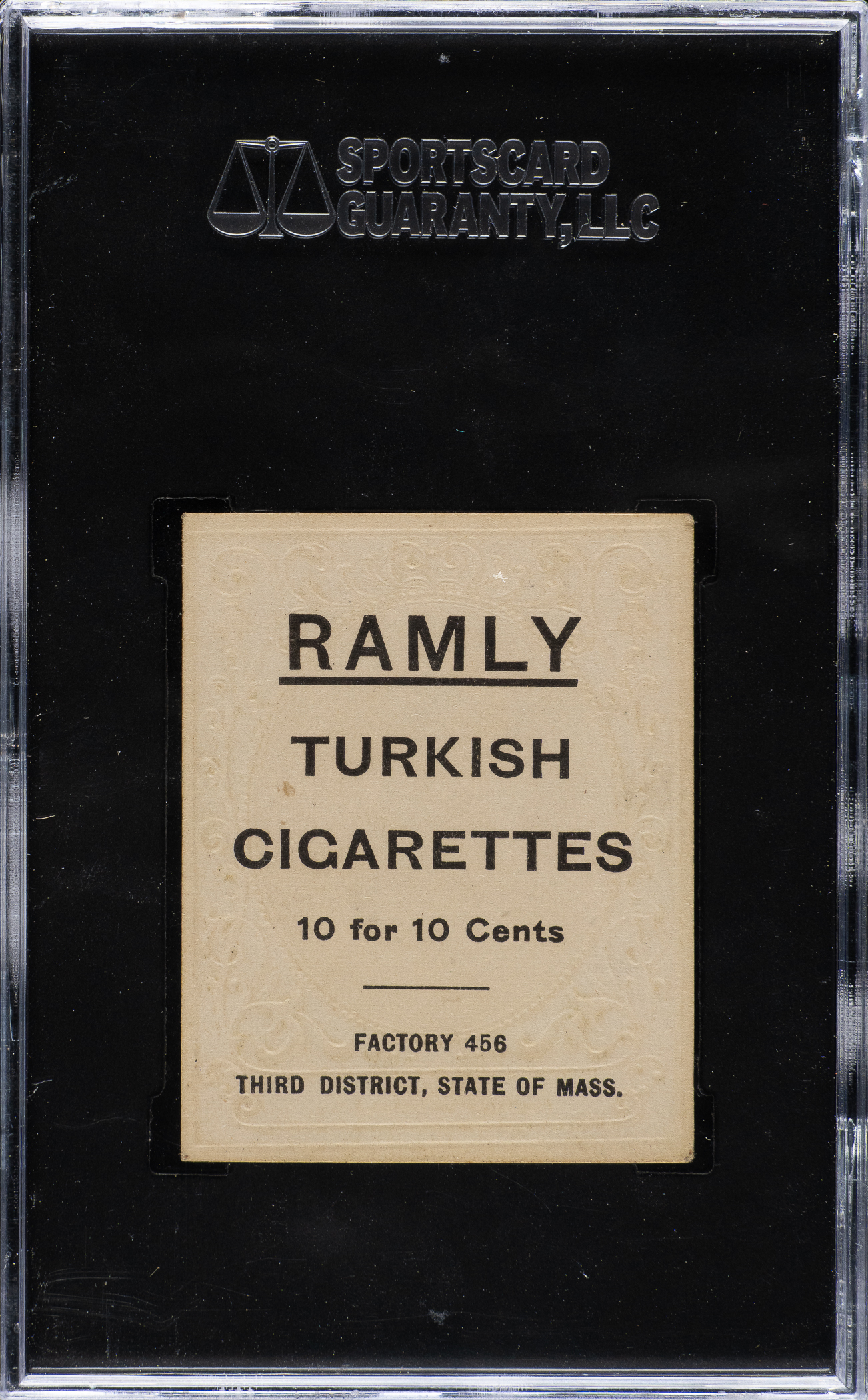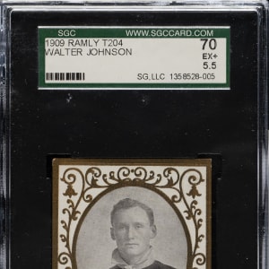 Graded EX+ 5.5 by SGC. Outstanding high-grade example of Hall of Famer Walter Johnson (Washington Senators) from the T204 Ramly set, one of the most popular of all 1910-era tobacco issues. This is one of tobacco-card collecting's classics. One of Johnson's rarest cards, it is also the key card from the Ramly Tobacco set. Ramlys, which are highly prized among collectors for their distinctive style and rarity, are among the most condition-sensitive sets in existence, with fragile gold borders easily susceptible to chipping. The offered example has a striking portrait image and outstanding centering and gold borders. The reverse is clean with bold black print. This is an exceptionally attractive example, offered in a much higher grade than normally encountered, of the key card from one of tobacco-card collecting's most highly respected and beautifully designed sets. This card would be a significant highlight in a world-class T204 Ramly, Walter Johnson, or classic-card collection.