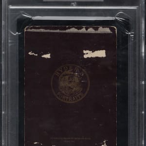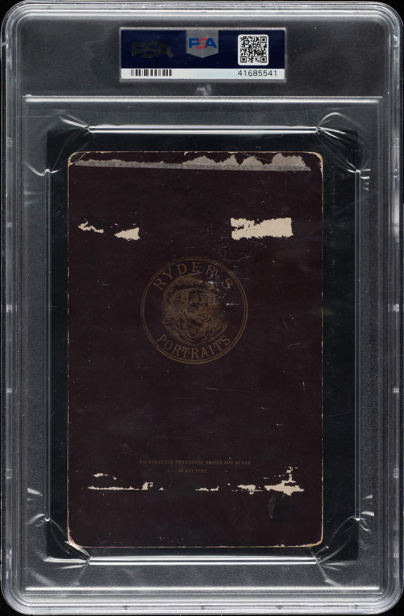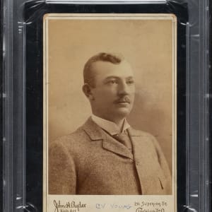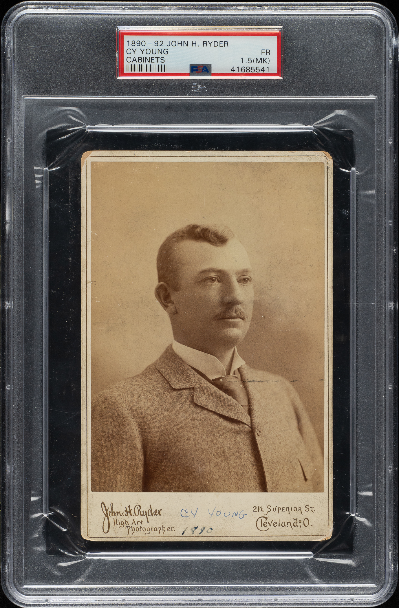 Graded FAIR 1.5 (MK) by PSA, the offered example boasts an exceptional presentation and a display value far exceeding its assigned grade. The image of Young is crisp and clear, with the image centered perfectly upon the mount. Ideally, a handwritten notation of "Cy Young / 1890" is present in the bottom margin of the mount, flanked on either side by the photographer's name and address. Measuring approximately 4-3/16 by 6-1/2 inches, the cabinet card exhibits light wear at the corners but is remarkably preserved given its age. The black reverse, which features a gold embossed logo of "Ryder's Portraits," displays several small areas of adhesive residue, almost certainly from mounting within a scrapbook, which was an extremely common method of display and storage at the time.