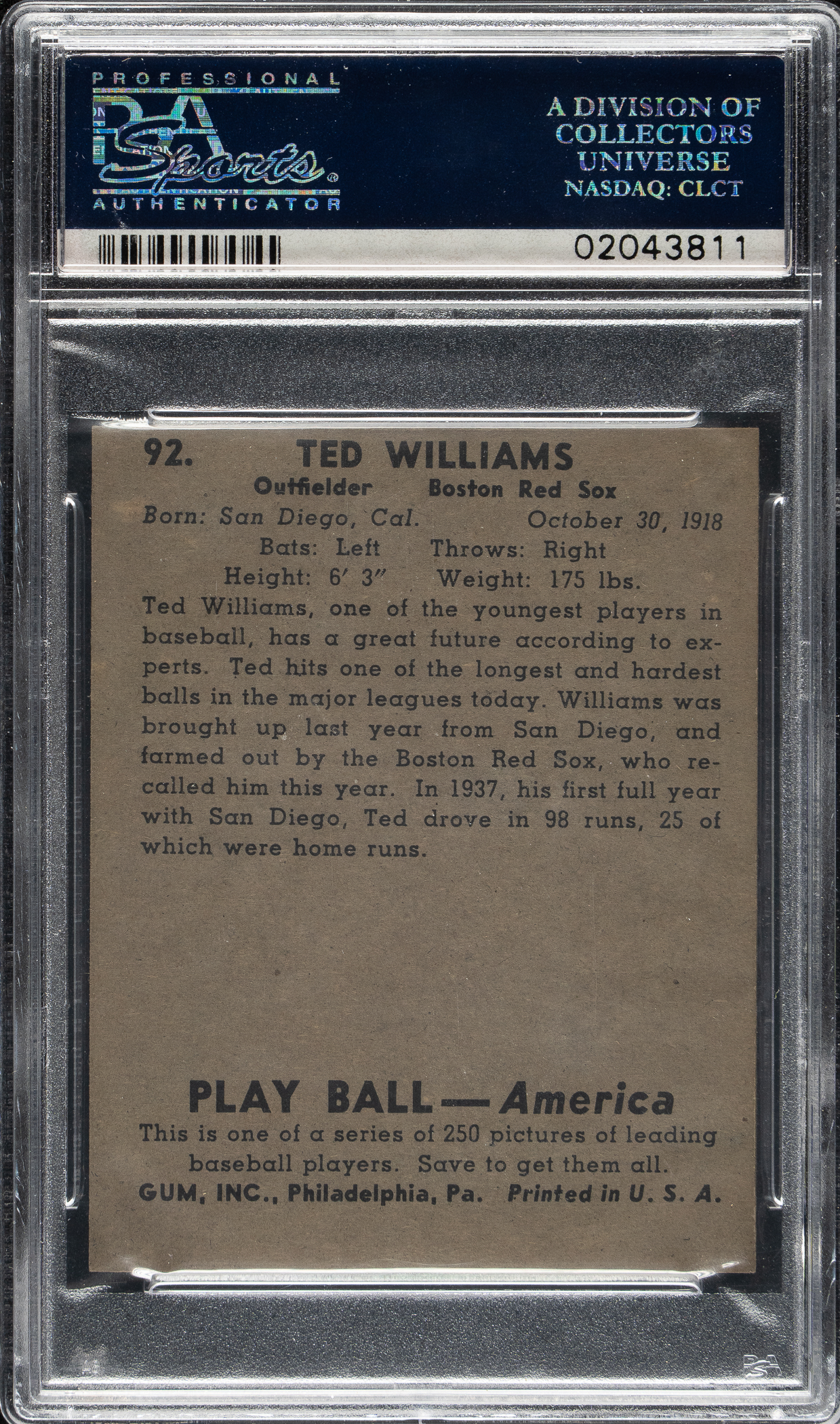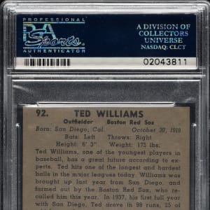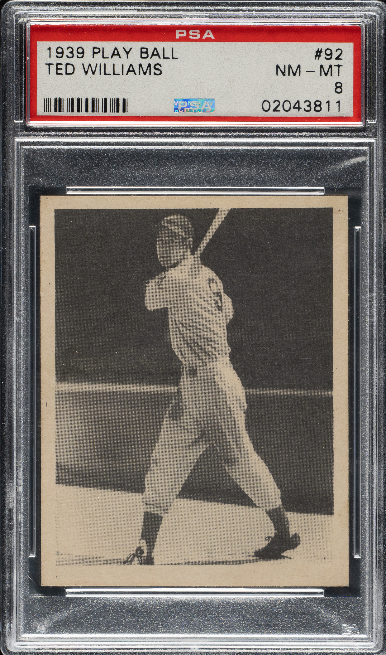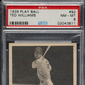 Graded NM-MT 8 by PSA. Superb high-grade example of this classic card featuring Boston Red Sox Hall of Famer Ted Williams in his rookie season. Williams' rookie card is the key to the 1939 Play Ball set and one of the most popular and significant of all postwar baseball cards. It is fascinating to note that the text on the back of this rookie card reports that Ted "has a great future according to experts." This is a tremendous example of one of the key cards from the 1939 Play Ball set and one of the most popular cards of the era in extraordinary overall condition.
