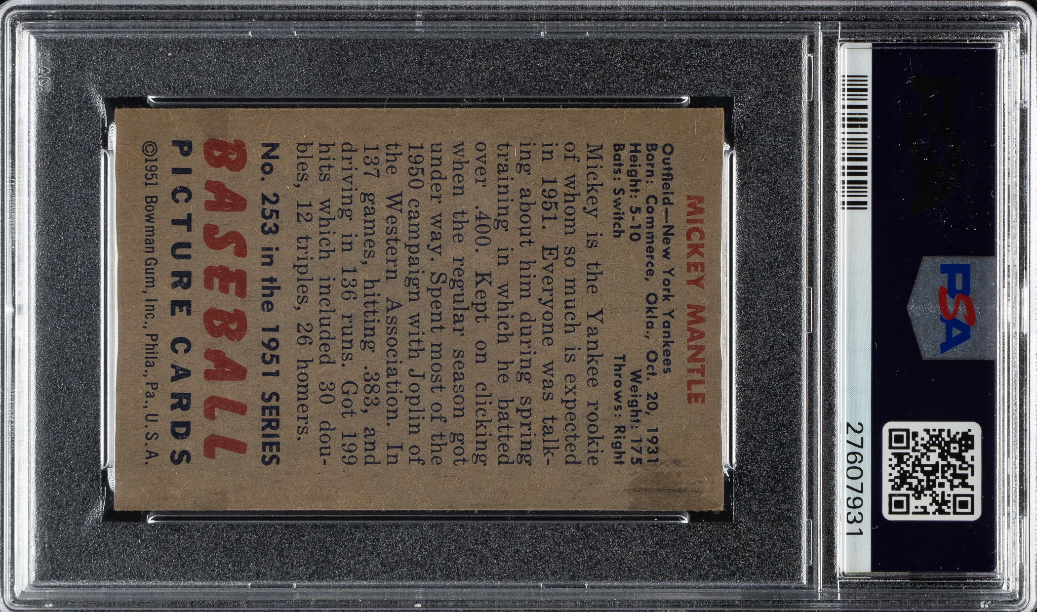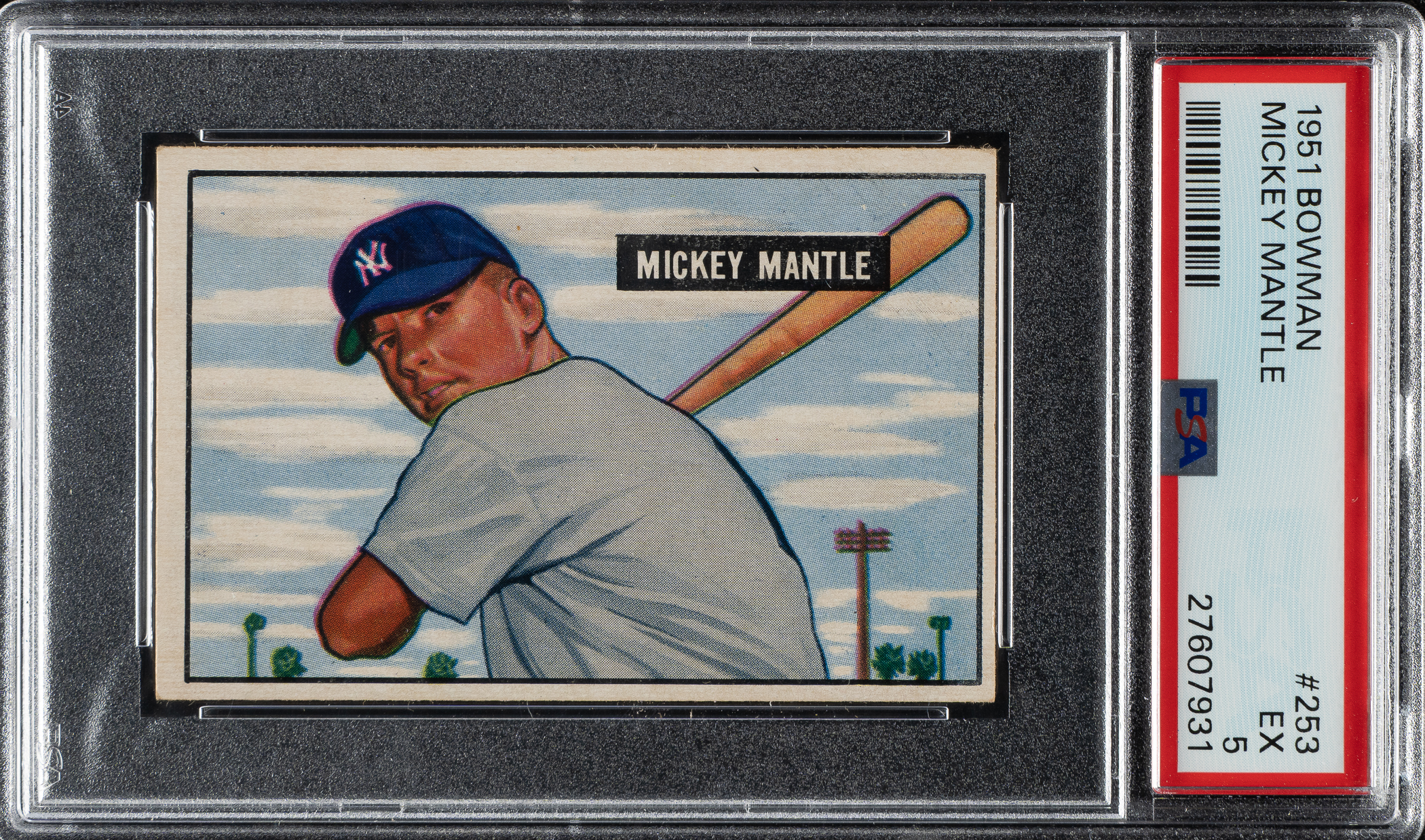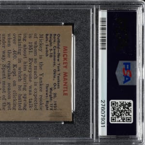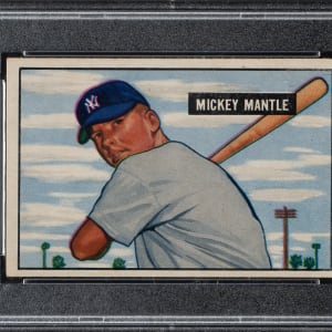 Graded EX 5 by PSA. Superb example of New York Yankees Hall of Famer Mickey Mantle from the 1951 Bowman series. This iconic rookie card of Mantle would be a worthy addition to any Mickey Mantle or classic-card collection.