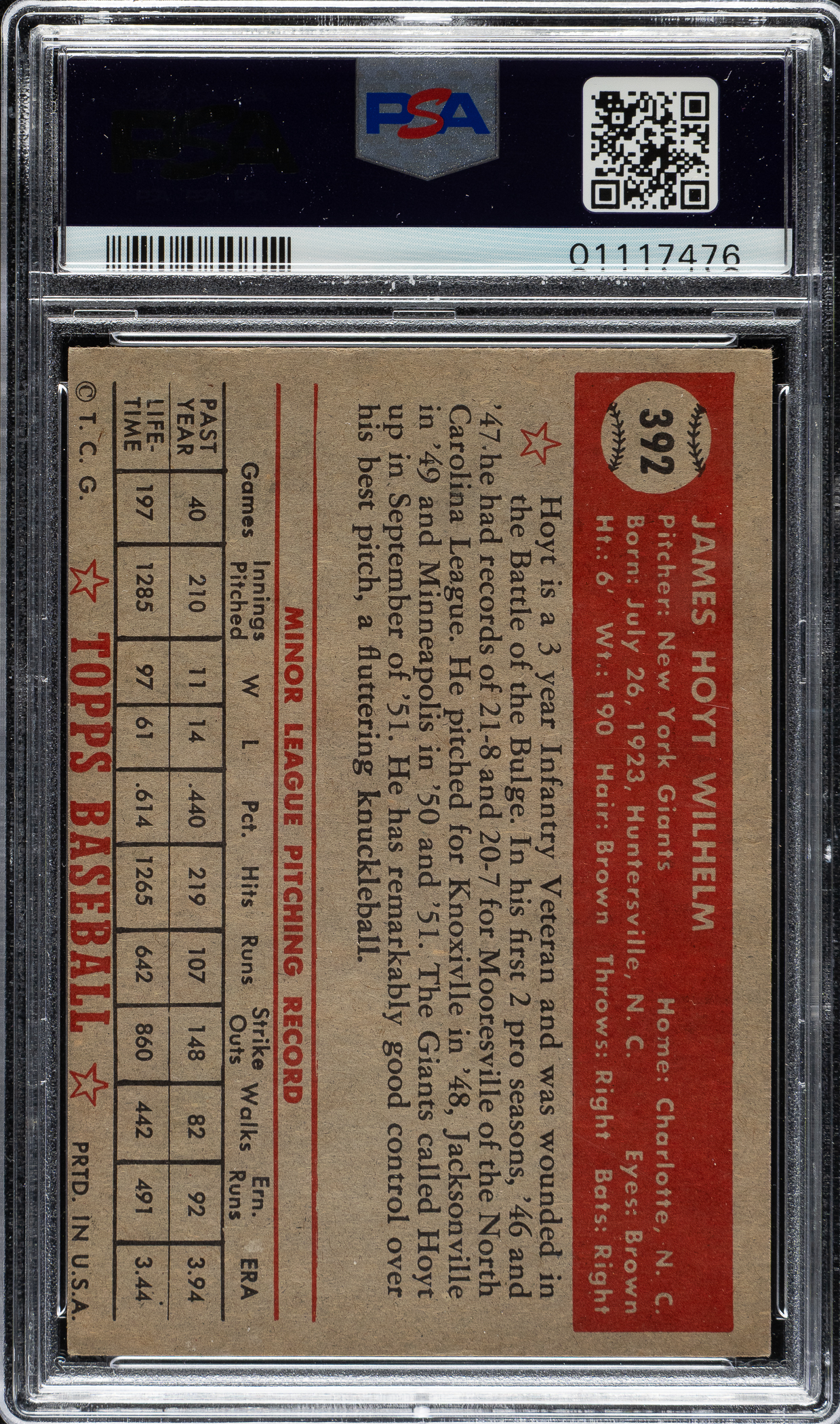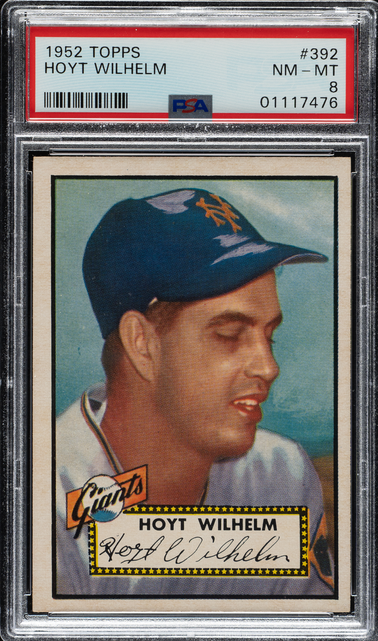 Graded NM-MT 8 by PSA. New York Giants Hall of Famer Hoyt Wilhelm.