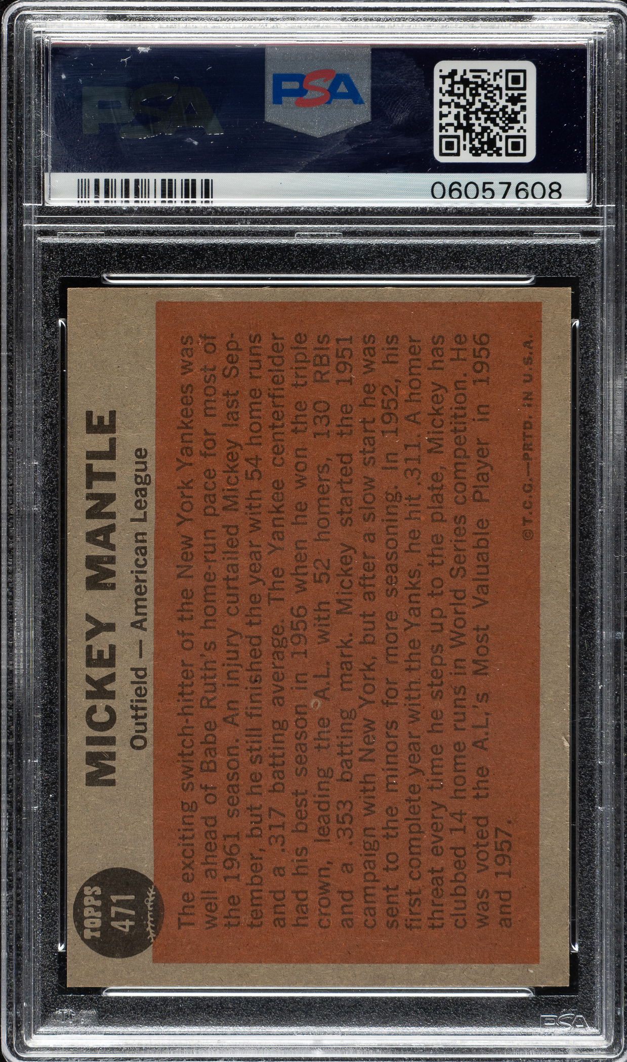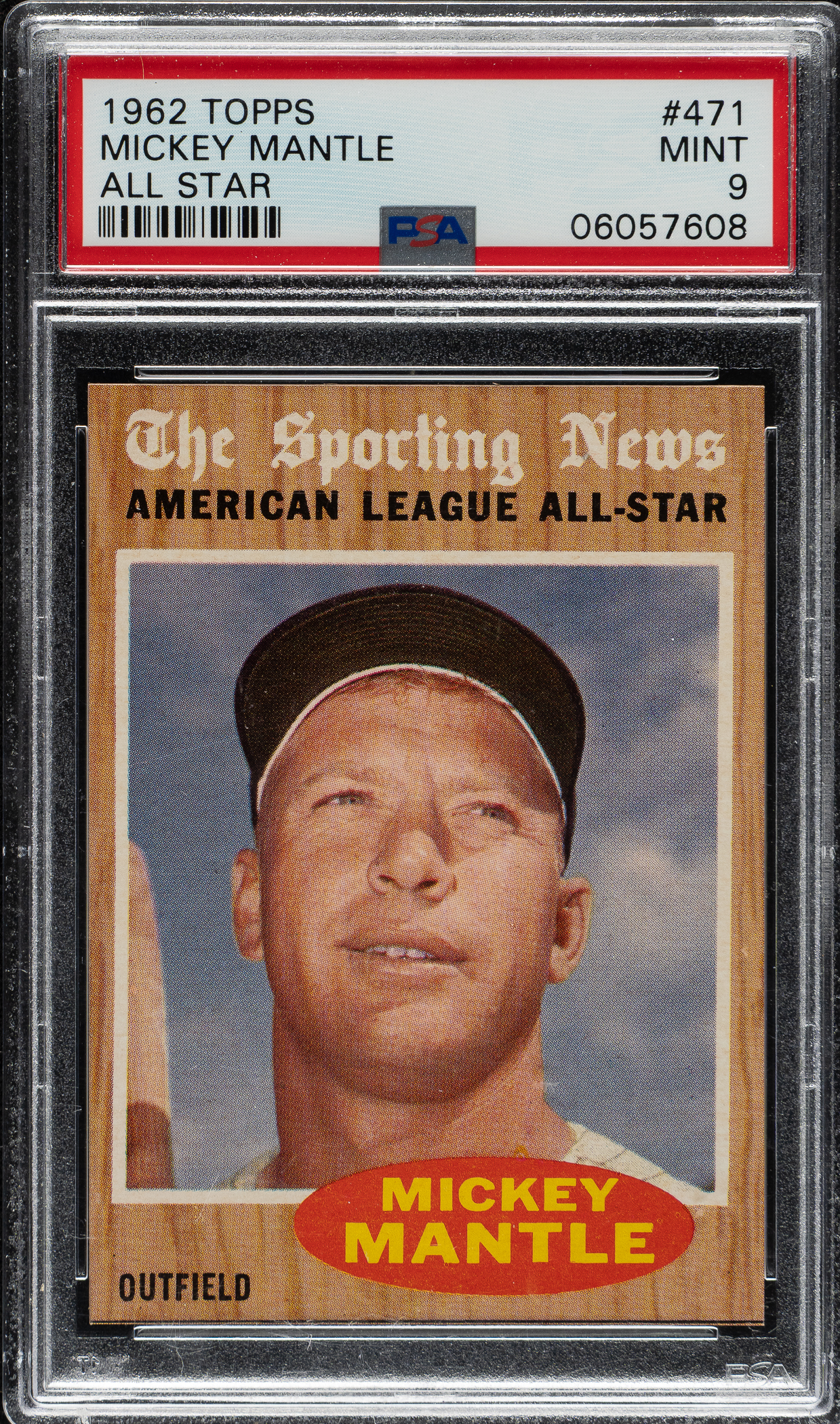 Graded MINT 9 by PSA. One of only eleven examples graded at this level with none higher by PSA! Extraordinary high-grade example of #471 Mickey Mantle All-Star from the condition-sensitive 1962 Topps set. A worthy addition to any Mickey Mantle, New York Yankees, or 1962 Topps collection!
