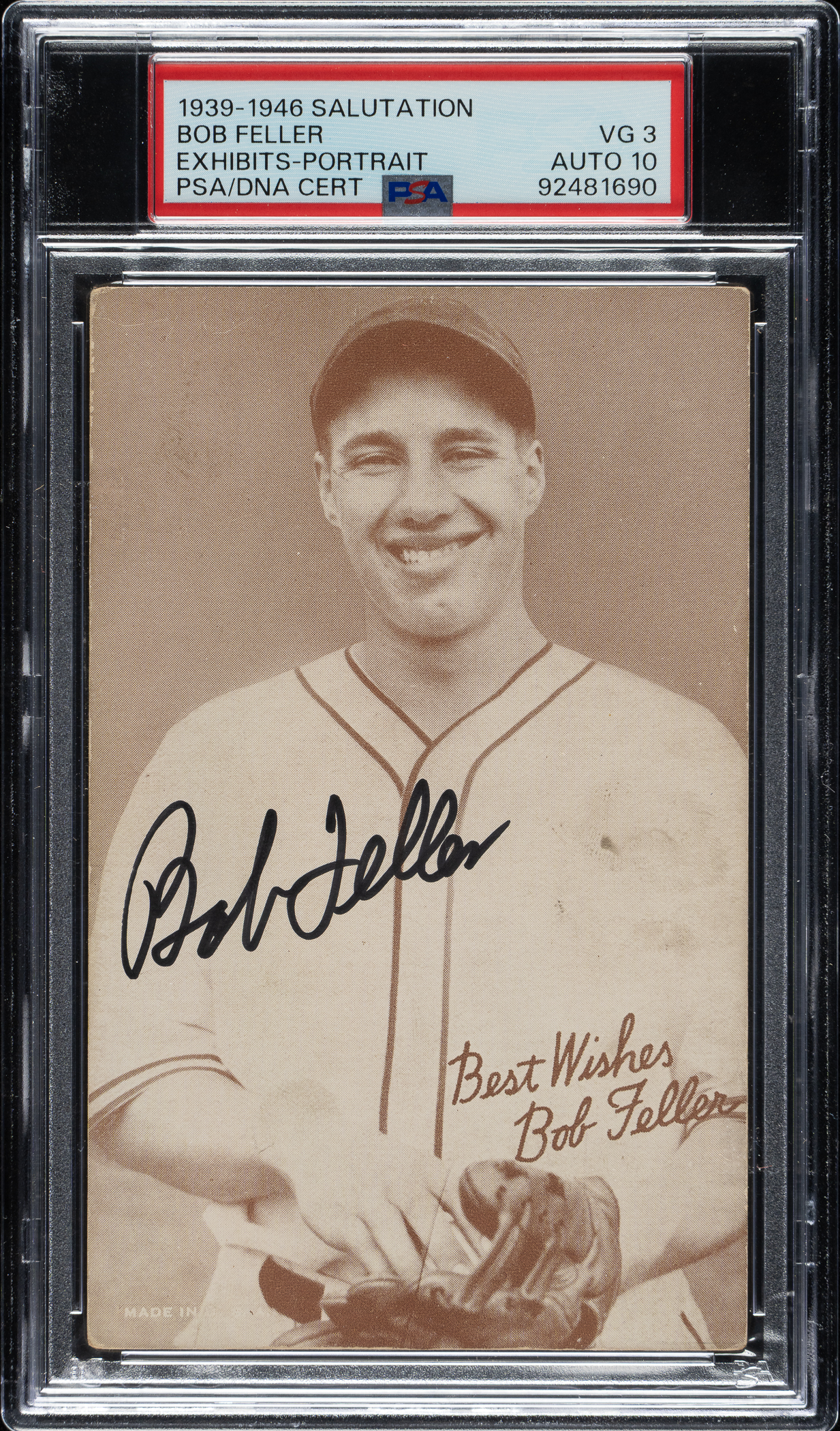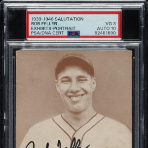 PSA/DNA has encapsulated the card, grading the signature GEM MINT 10 and the card VG 3. Cleveland Indians Hall of Famer Bob Feller.