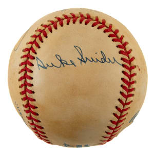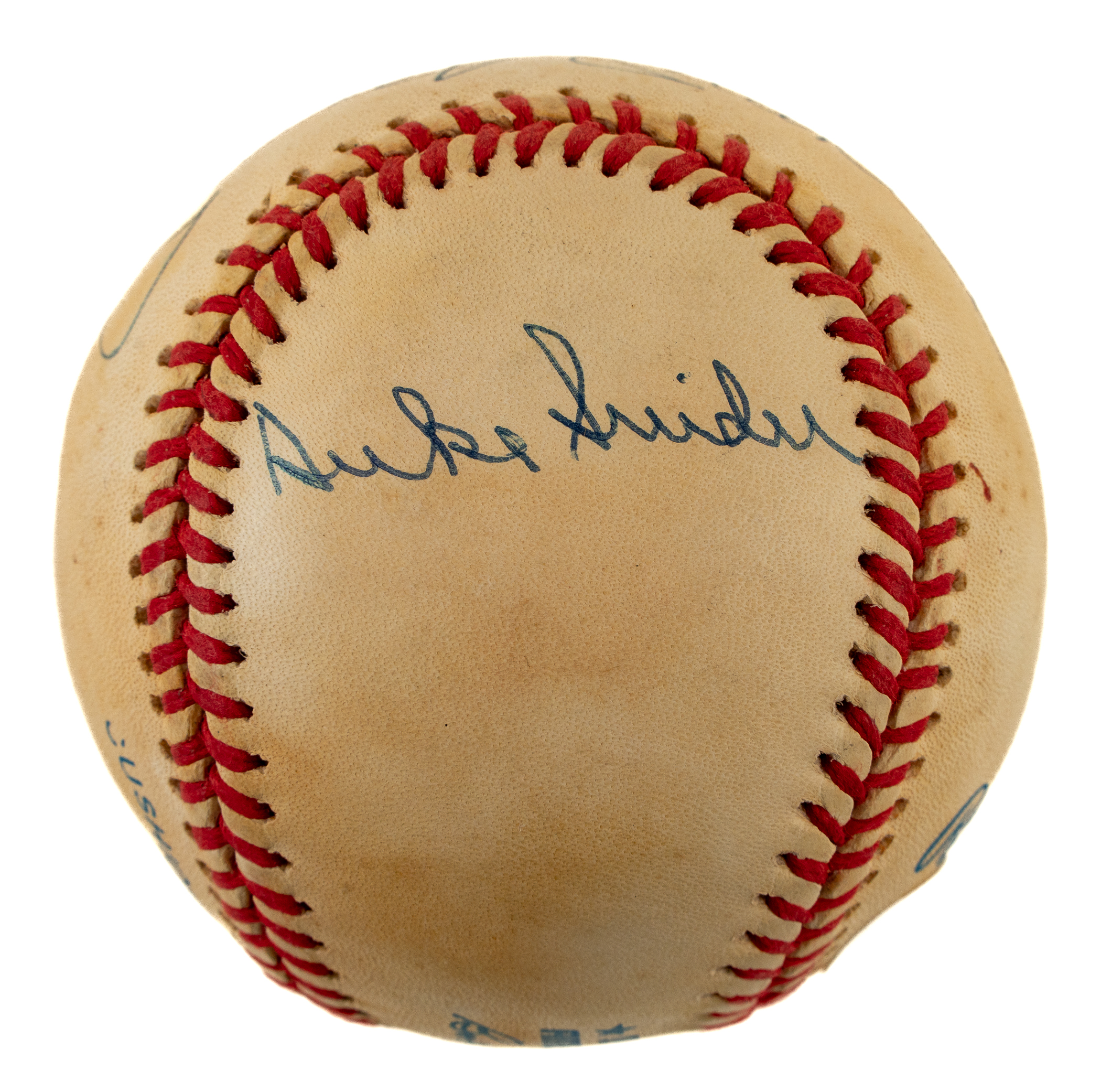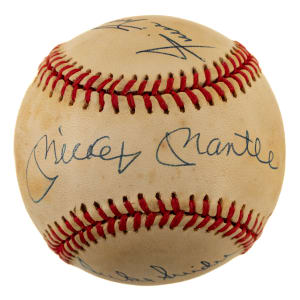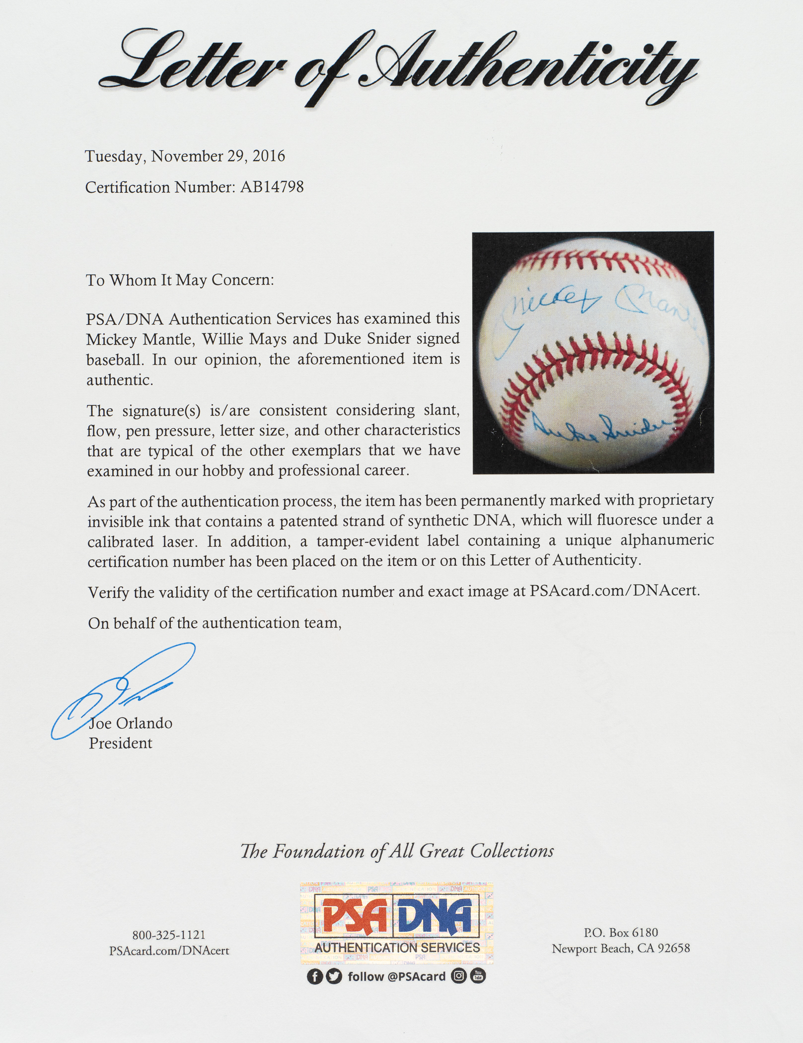 Brooklyn Dodgers, New York Yankees, and New York Giants Hall of Famers Duke Snider, Mickey Mantle, and Willie Mays signed baseball. Full LOA from PSA/DNA.