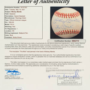 New York Yankees Hall of Famer Mickey Mantle. Full LOA from James Spence/JSA.