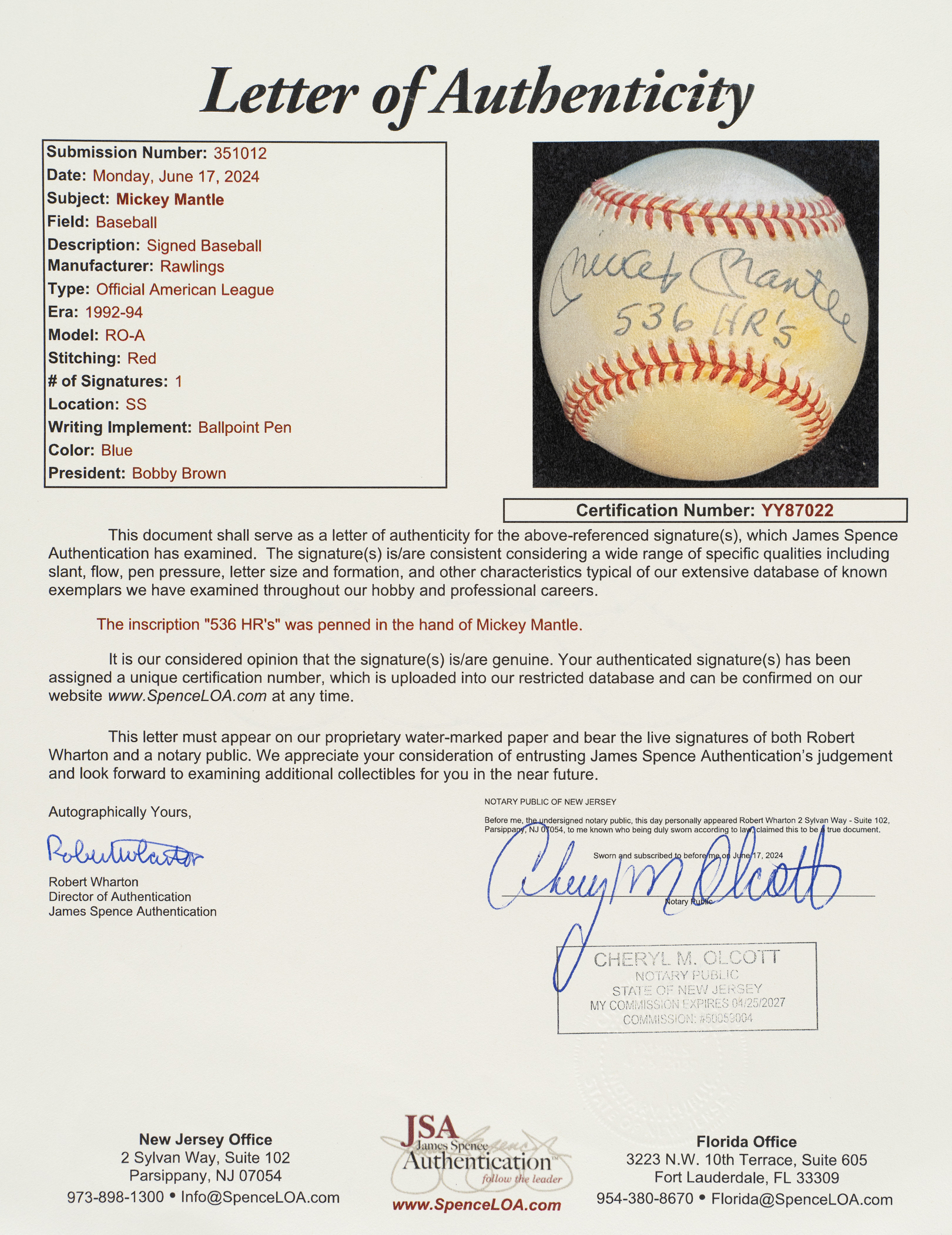 New York Yankees Hall of Famer Mickey Mantle. Full LOA from James Spence/JSA.