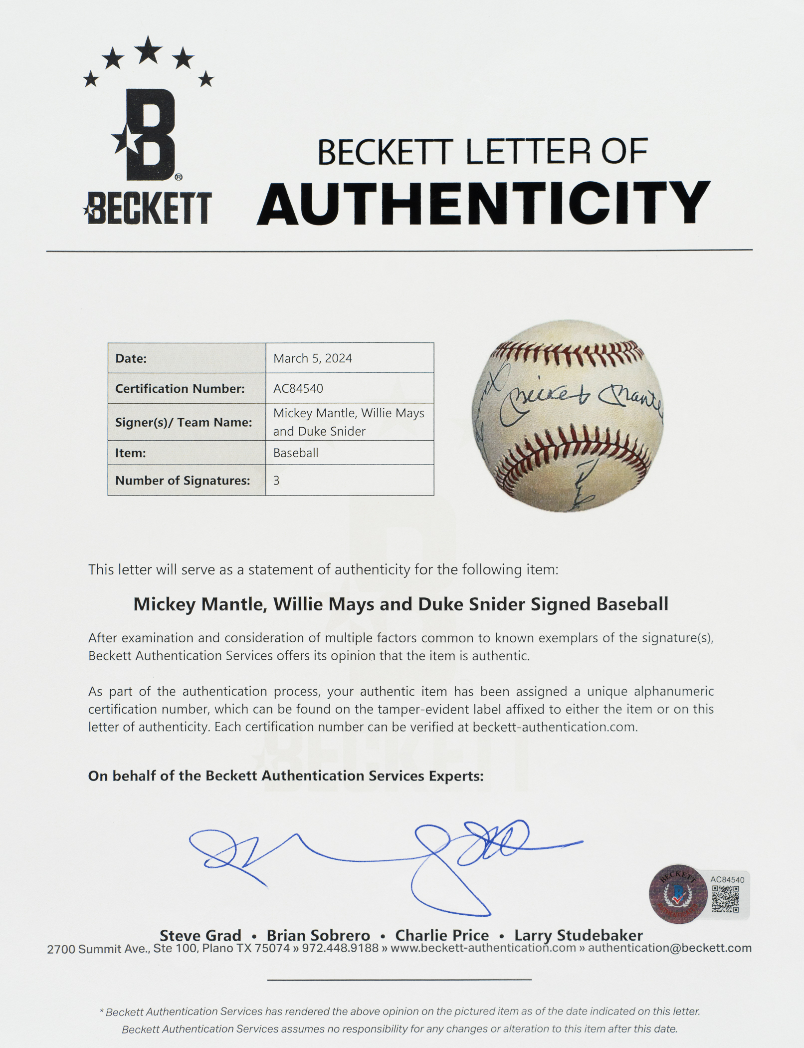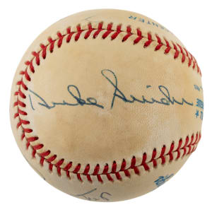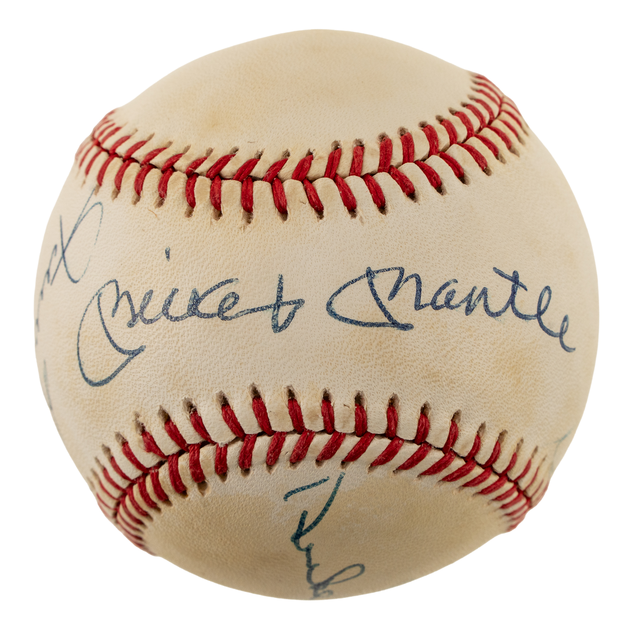 Brooklyn Dodgers, New York Yankees, and New York Giants Hall of Famers Duke Snider, Mickey Mantle, and Willie Mays signed baseball. Full LOA from Beckett.