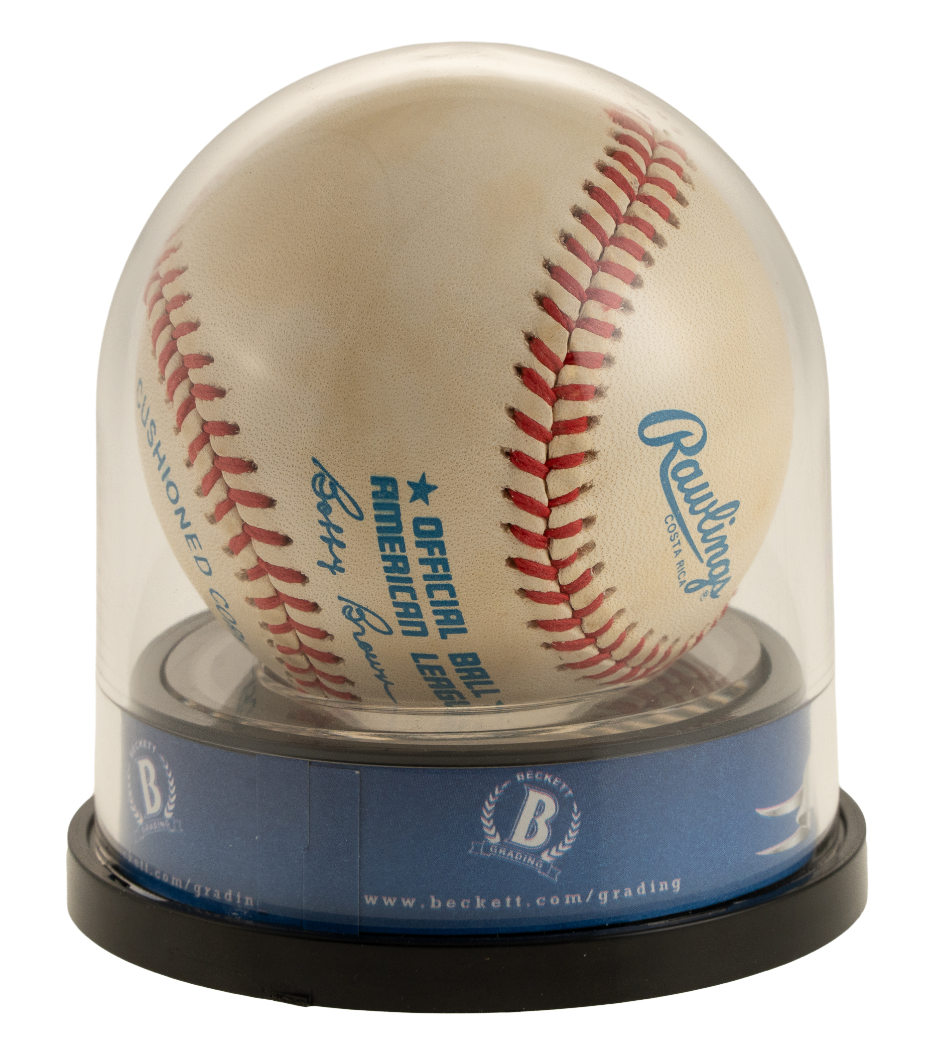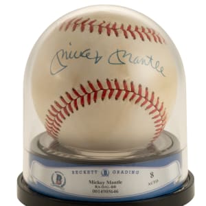 New York Yankees Hall of Famer Mickey Mantle. Beckett has encapsulated the ball, grading the signature NM-MT 8. The size/weight of this item requires that there will be an additional shipping charge for this lot.