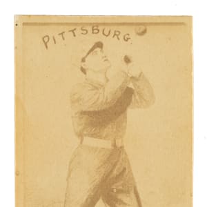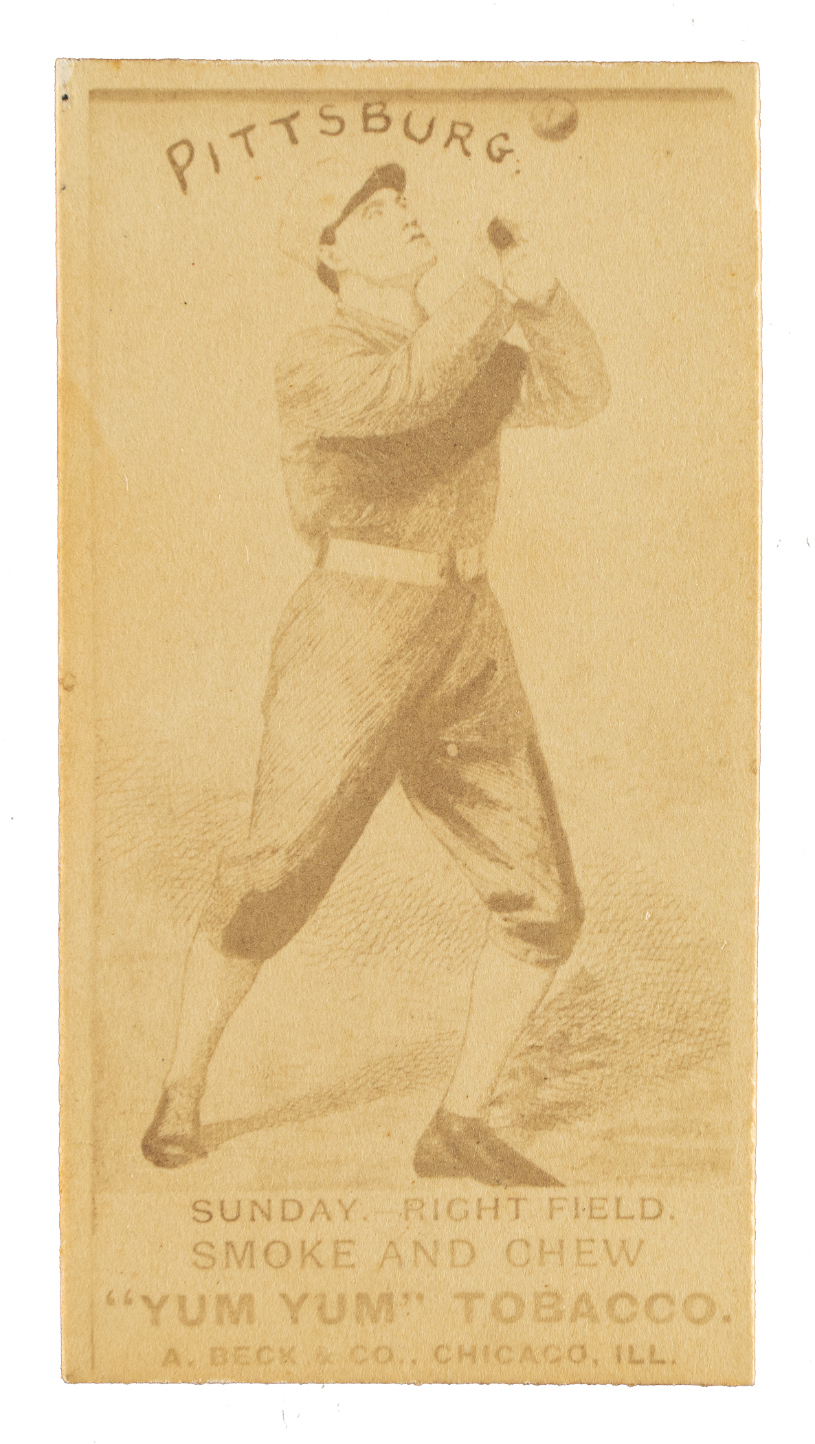Extremely rare sample card from the Yum Yum Tobacco series of 1888 features a woodcut of legendary ballplayer-turned-evangelist Billy Sunday, right fielder for the Pittsburgh Nationals. 1888 was Sunday's first season with Pittsburgh, having spent his entire Major League career up to that season as backup outfielder with the powerhouse Chicago Nationals. Yum Yums are one of the 19th century's legendary rarities. In fact, only 125 examples have been graded by SGC and PSA combined! This is only the second example of this particular Sunday card that we have offered in the past 22 years. The offered example is one of eight N403 Yum Yum cards recently discovered at a public auction in Arizona. At the time, each card was affixed to a backing and presented in a framed display. Our consignor, the buyer at that sale, carefully removed each card from the backing, which were affixed with vintage clear tape (has yellowed over time). Yum Yum Tobacco was a brand of the August Beck & Company of Chicago. Advanced collectors have appreciated the mystique of the rarest pre-1900 baseball-card issues for decades. Whether it is because of the brand name, their unusual look, extreme rarity or a combination of all of these factors, few card issues command the respect that Yum Yum Tobacco cards do among the most serious collectors. It is always a privilege to offer a Yum Yum, regardless of condition. The offered example has light corner wear, a tiny crease on the lower-left edge, and tape across the reverse of the card. This newly-discovered card remains an outstanding example from this extremely rare and desirable 19th-century set, featuring one of the 19th century's most legendary American figures, Billy Sunday.