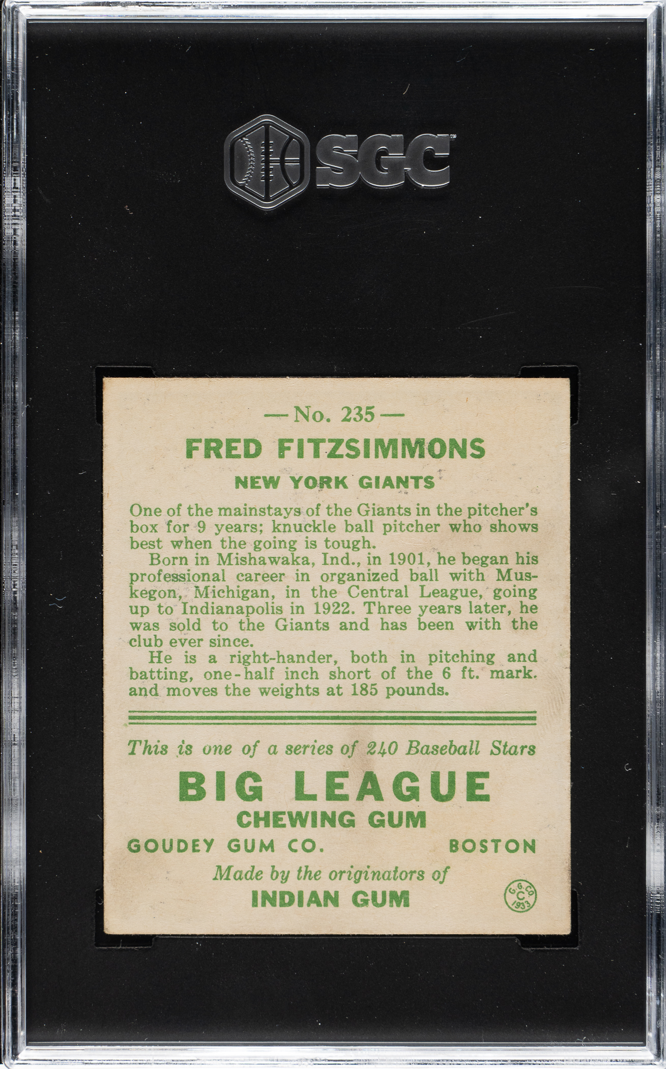 1933 R319 Goudey #235 Fred Fitzsimmons SGC NM 7