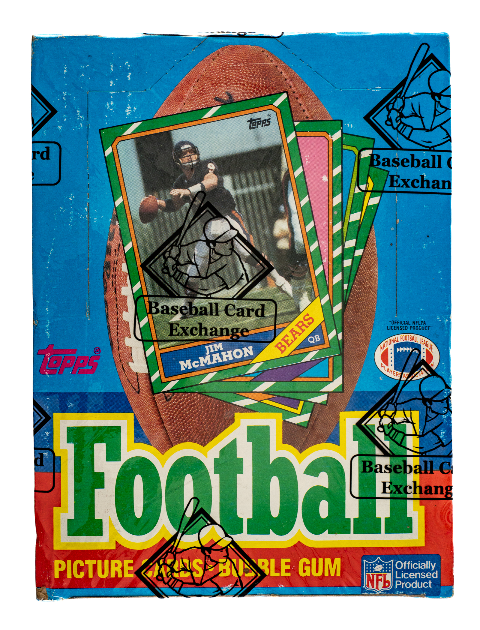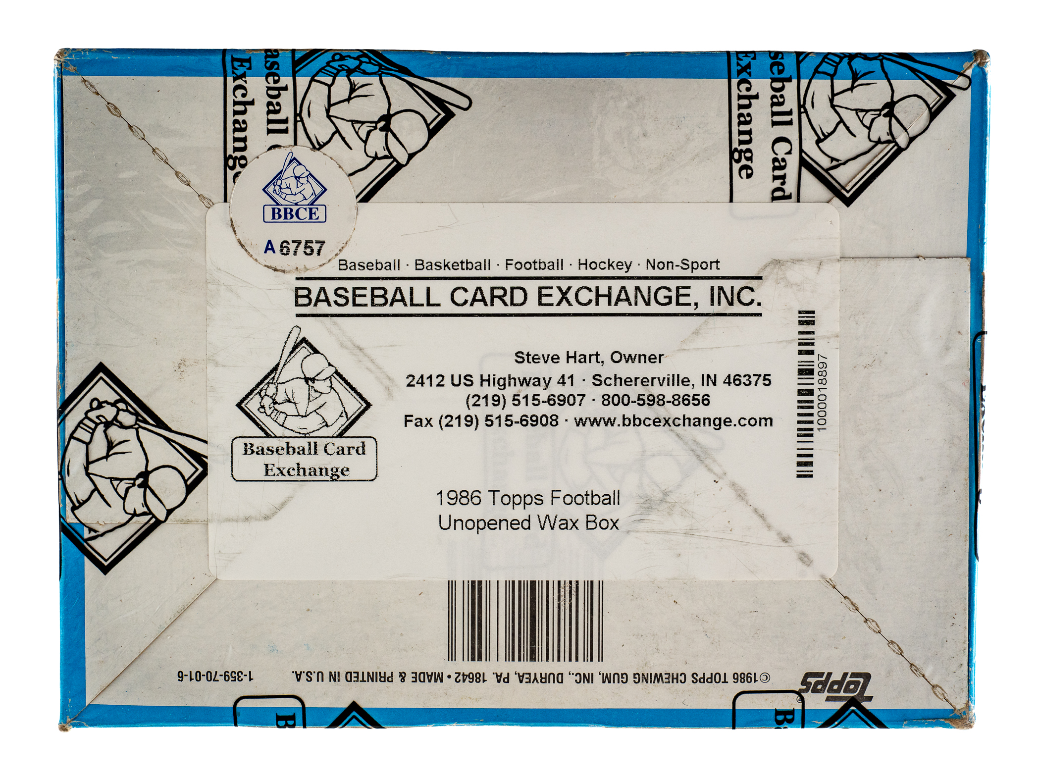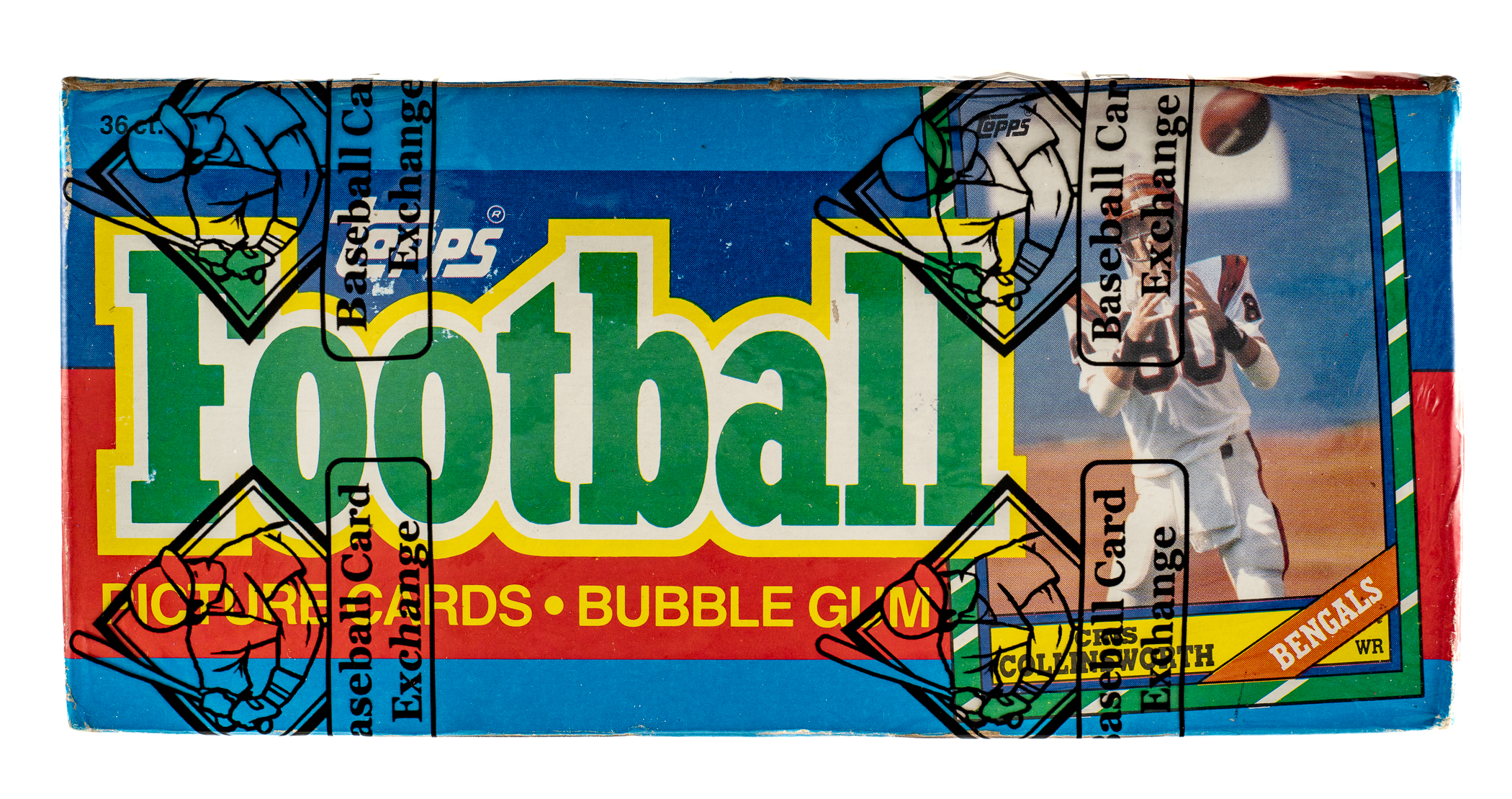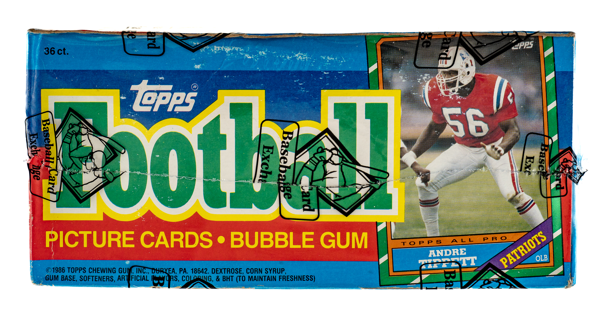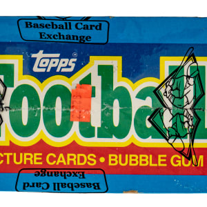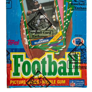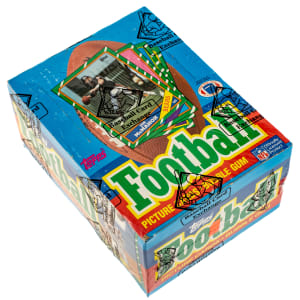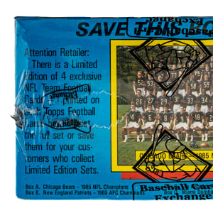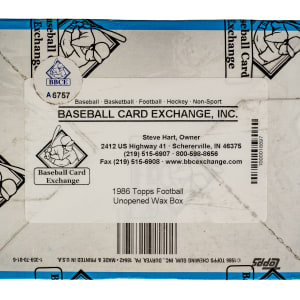 Complete, original unopened wax box of 1986 Topps football. The box houses thirty-six packs with each pack containing seventeen cards, for a total of 612 cards. The 1986 Topps set features rookie cards of Hall of Famers Jerry Rice, Steve Young, Reggie White, Andre Reed, and Bruce Smith. This box comes shrink-wrapped by Baseball Card Exchange (owned by Steve Hart, the foremost expert on unopened material). The size/weight of this item requires that there will be an additional shipping charge for this lot.