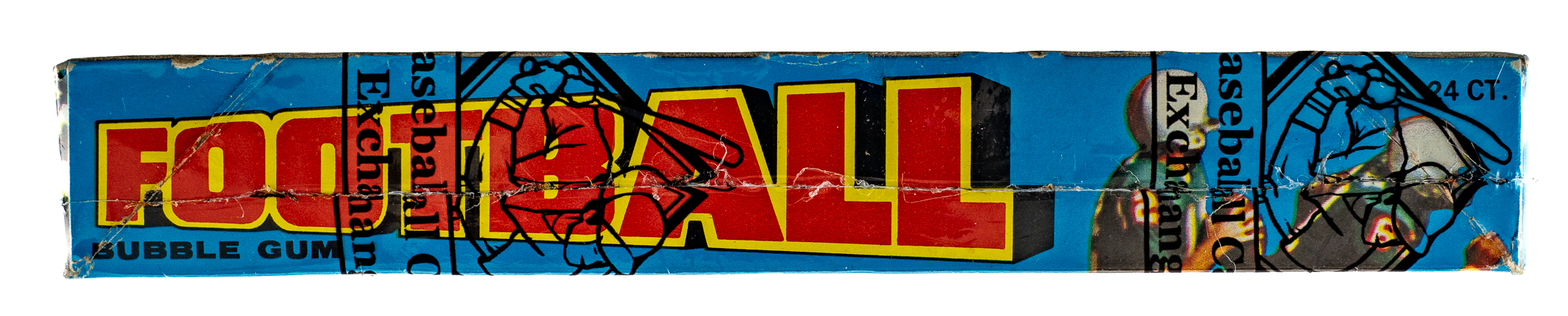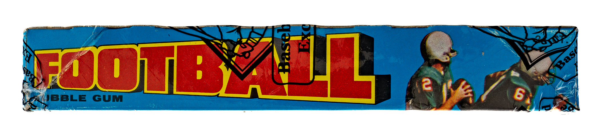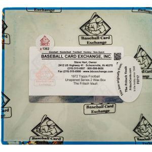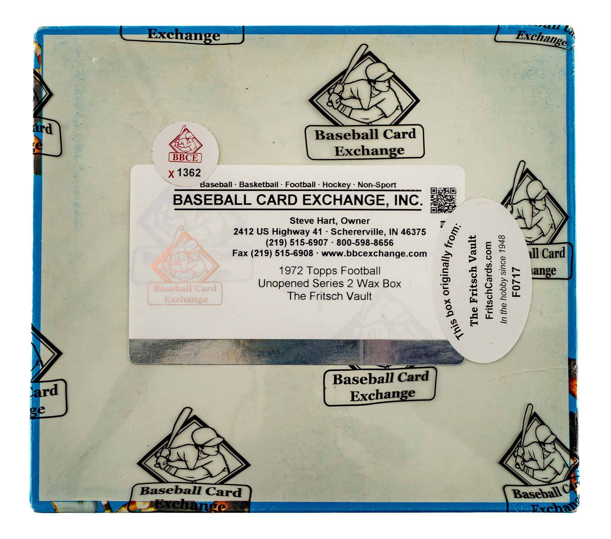Complete, original unopened wax box of 1972 Topps football. The box houses 24 packs with each pack containing 10 cards for a total of 240 cards. This is a second-series box (#133-263), a series that includes Roger Staubach (rookie card), Terry Bradshaw, and Johnny Unitas, as well as numerous other stars and Hall of Famers. This wax box originates directly from the legendary Larry Fritsch Vault. It comes shrink-wrapped by Baseball Card Exchange (owned by Steve Hart, the foremost expert on unopened material) and bears his certified designation as having originated from the "Fritsch Vault." This is a stunning, complete, unopened wax box. The size/weight of this item requires that there will be an additional shipping charge for this lot.