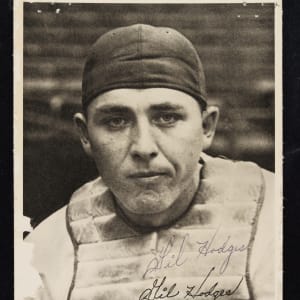 Exceedingly rare signed 1947 Brooklyn Dodgers Picture Pack featuring Hall of Famer Gil Hodges. This piece features Hodges in his rookie season donning catcher's equipment prior to him transitioning to first base full-time. While unsigned examples do appear from time to time, signed examples are nearly impossible to find. In fact, this is the only signed example we have ever handled! Hodges has boldly penned his name directly above the facsimile signature on his chest protector. The piece presents extremely well despite a few minor condition issues, including small areas of paper loss on the edges. It has also been neatly mounted to a thin backing. Regardless of these issues, this remains an exceptional piece for any advanced Hodges or Brooklyn Dodgers collector. Full LOA from PSA/DNA.