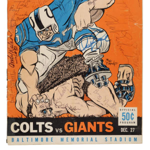 Program from the 1959 NFL Championship game between the New York Giants and Baltimore Colts signed by more than 30 individuals, including nine Hall of Famers. This game was a rematch of the 1958 NFL Championship game between the two teams, which is often referred to as "The Greatest Game Ever Played." As was the case in 1958, the Colts emerged victorious again the following year for back-to-back championships. This colorful program from Baltimore Memorial Stadium is adorned on the front with a number of signatures in a variety of different - mostly ballpoint - pens. Hall of Famer Johnny Unitas' vintage signature can be found in the upper right corner. Additional Hall of Famers who have signed the piece are Weeb Ewbank, Raymond Berry, Jim Parker, Art Donovan, Lenny Moore, Gino Marchetti, Frank Gifford, and Sam Huff. Notables Alan Ameche and Kyle Rote are also included. Some players have opted to sign the interior of the program, but the majority are on the front, making for an outstanding display piece commemorating this early NFL Championship. The program remains in Very Good condition overall, with a few light creases and four spots of tape along the spine. Full LOA from James Spence/JSA.