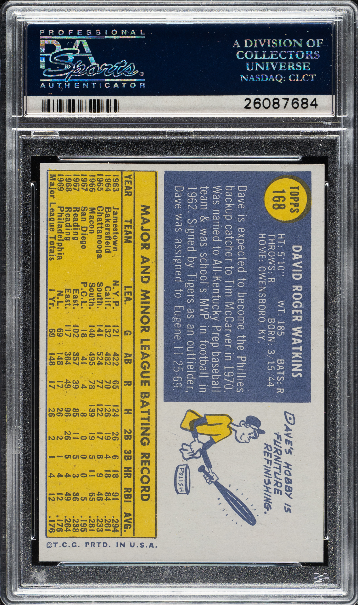 1970 Topps #168 Dave Watkins PSA GEM MINT 10