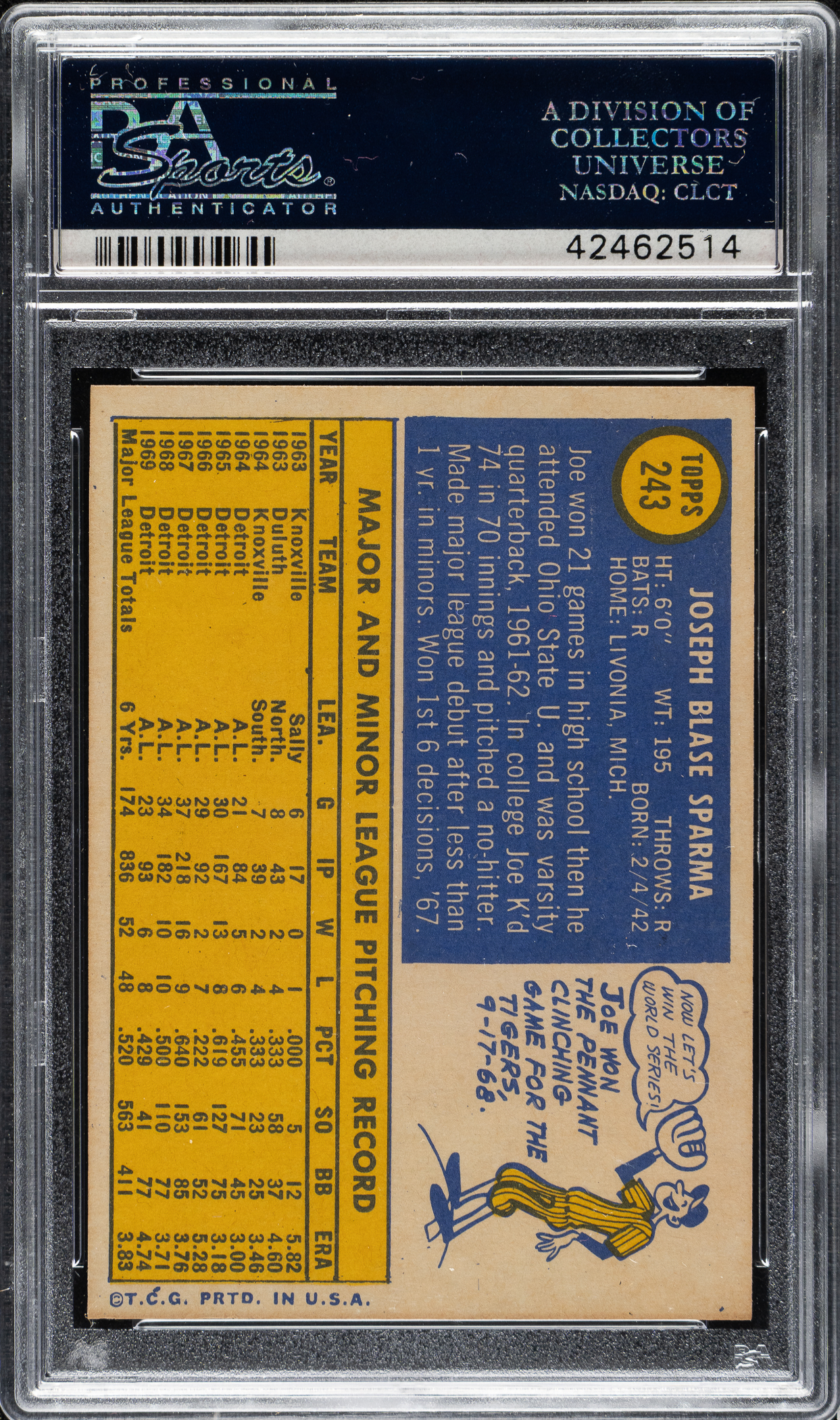 1970 Topps #243 Joe Sparma PSA GEM MINT 10