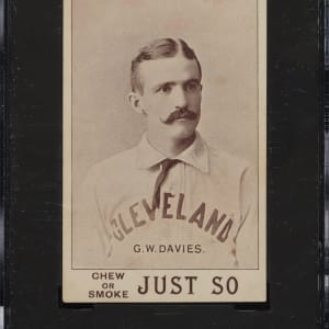 Graded EX 60 by SGC. Issued in 1893, Just So Tobacco cards are one of the most unusual and most obscure of all nineteenth-century baseball-card issues. Featuring portraits of the Cleveland Spiders, as they were known at the time, cards from this set are legendary for their incredible rarity. They are very distinctive both in size (measuring 2.5 x 3.875 inches) as well as their very close to black-and-white (yet, according to catalogs, still technically sepia) appearance. The 1890s were a very slow decade for baseball-card sets. Just So Tobacco is one of the very few issues of the era, adding to its great significance to collectors. Offered is Spiders' pitcher George W. Davies, identified beneath his portrait as "G. W. Davies." The Spiders of the 1890s earned the dubious distinction of being one of the dirtiest playing clubs to ever take the field in the history of the game. This is an extremely attractive example of this extraordinary rarity. The card is crisp and clean, both front and back, with perfect contrast, no creases or wrinkles, excellent centering, and four strong corners. Just So Tobacco cards are virtually nonexistent in the marketplace. We estimate that fewer than twenty-five examples in total are known to exist (PSA and SGC have combined to authenticate 25 examples of all players). When a Just So does come up for sale, it is almost always in low grade. This card has survived miraculously in incredible condition, and presents an extremely rare opportunity to acquire an extraordinary example of one of card collecting's most legendary sample-card rarities.