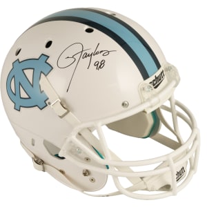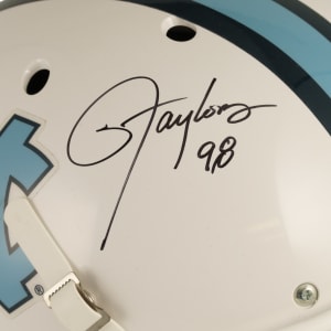 New York Giants football Hall of Famer Lawrence Taylor signed University of North Carolina helmet. James Spence/JSA certification sticker is affixed to the helmet. The size/weight of this item requires that there will be an additional shipping charge for this lot.