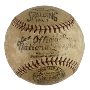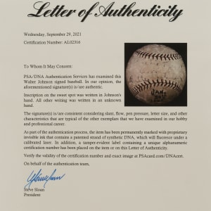 Official National League baseball signed by Hall of Famer pitcher Walter Johnson across the sweet spot. The Big Train has added a personalization atop his signature as well. Walter Johnson single-signed baseballs are particularly scarce and encountered far less frequently than other big-name Hall of Famers of his era. To date, REA has only offered fifteen Johnson singles in the last twenty years. Graded and authenticated VG 3 by PSA/DNA, the offered baseball displays consistent and even wear throughout. Johnson's signature is fully legible - bolder in the first half of his name. The personalization has faded over time, but a handwritten date (in a hand other than Johnson's) of January 20, 1925 remains boldly placed on a side panel. Full LOA from PSA/DNA.