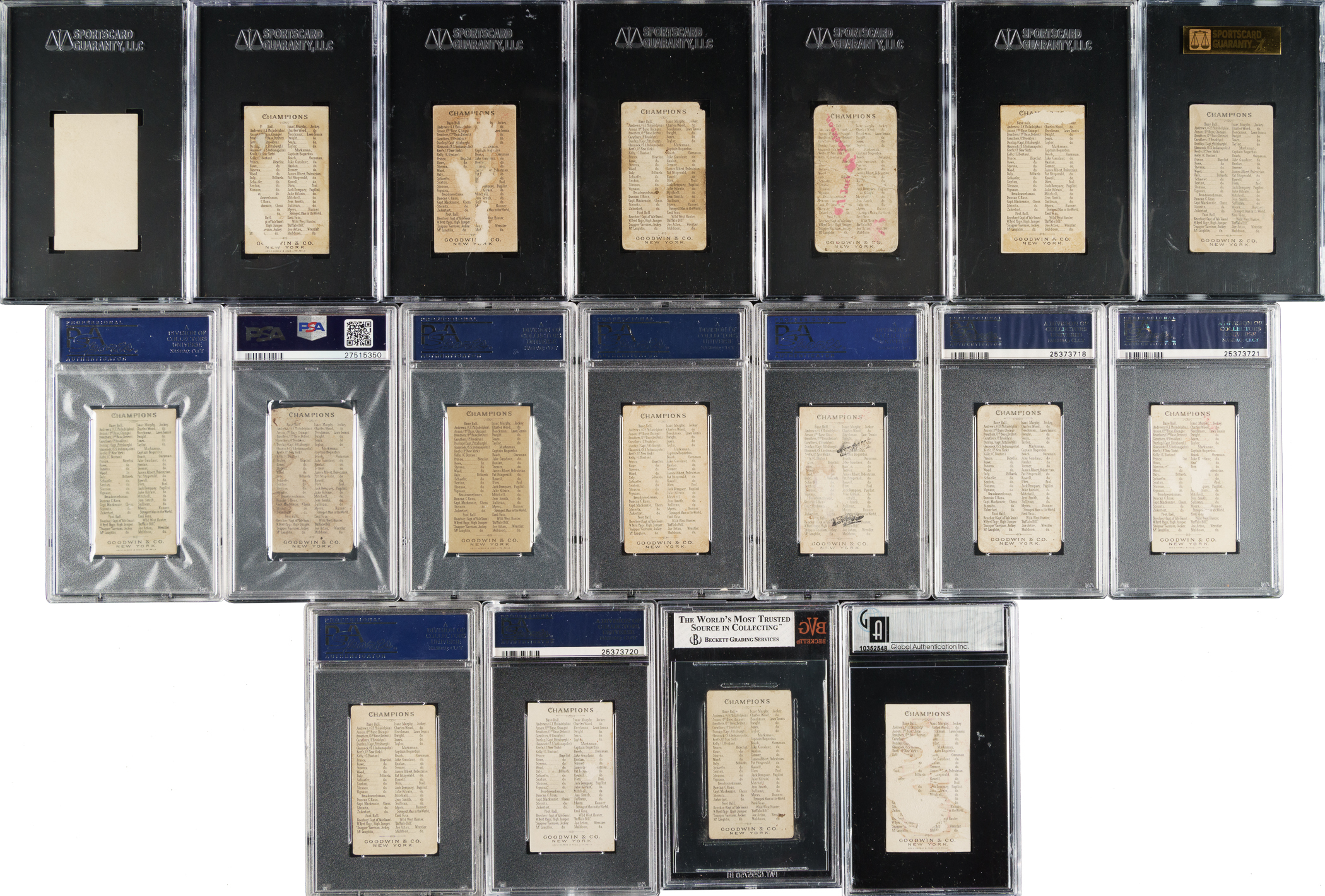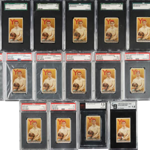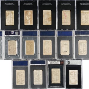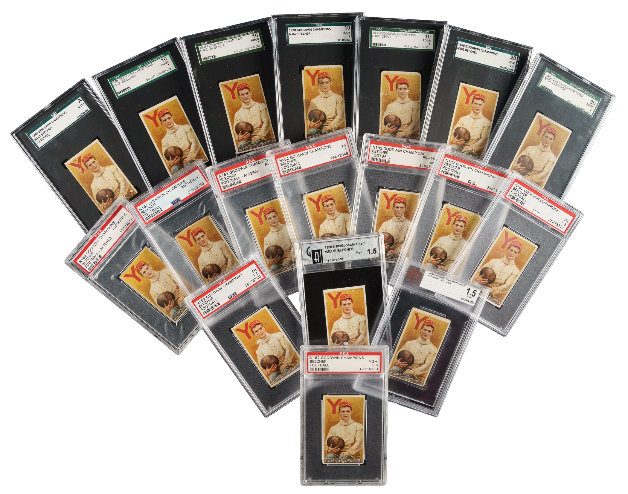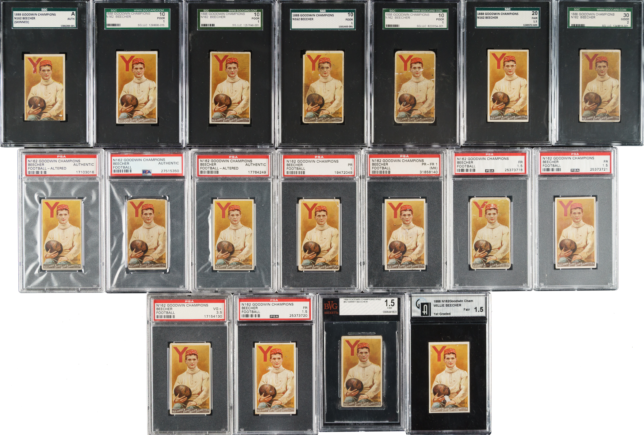 While debate has raged regarding what constitutes the "first" baseball card, that controversy has never approached the gridiron realm of our industry. Harry Beecher was a quarterback and captain of the 1884-1887 Yale Football teams. Offered is an impressive collection of eighteen different examples of the first football card from this very popular and colorful set of fifty, issued by Old Judge and Gypsy Queen. All eighteen cards have been graded and encapsulated by PSA (9), SGC (7), GAI (1), and Beckett (1), highlighted by a VG+ 3.5 example graded by PSA. Grading Composite: VG+ 3.5 (1 card [PSA]). GOOD 2 (1 card [SGC]). FAIR 1.5 (6 cards [3 PSA, 1 SGC, 1 BVG, and 1 GAI]). FAIR 1.5 [MK] (1 card [PSA]). POOR 1 (5 cards [1 PSA and 4 SGC]). Authentic (4 cards [3 PSA and 1 SGC]). This is undoubtedly the most extensive collection of N162 Beecher's we've ever seen, and it is likely the largest grouping ever assembled. The collection represents about fifteen percent of the entire N162 Beecher graded population (excluding GAI), which presents a unique opportunity to acquire a substantial portion of the total known quantity of one of the most important cards in its respective set and one of the most famous football cards of the era.
