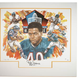 Chicago Bears Hall of Famer Gale Sayers signed lithograph. This limited-edition lithograph is numbered 291 out of 375. Basic certification from PSA/DNA. Total dimensions: 31-1/2 x 28-1/4 Inches. The size/weight of this item requires that there will be an additional shipping charge for this lot.