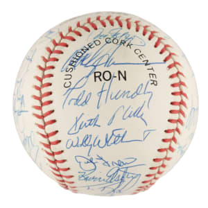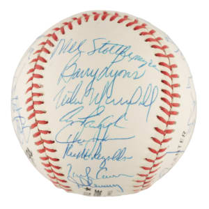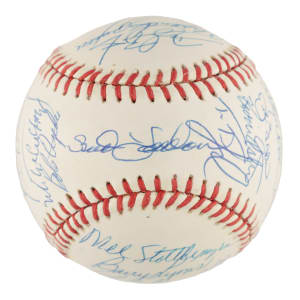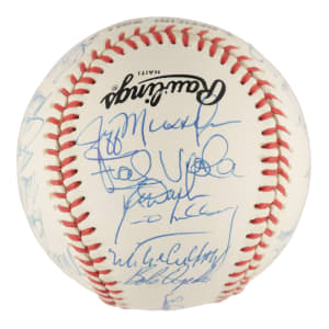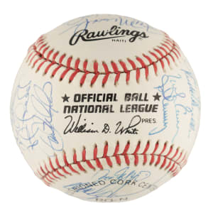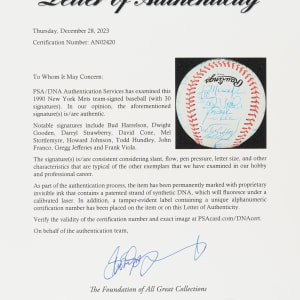 Official National League (White) baseball signed in blue ink by thirty members of the 1990 New York Mets. Notable signatures include Bud Harrelson, Dwight Gooden, Darryl Strawberry, David Cone, Mel Stottlemyre, Howard Johnson, Todd Hundley, John Franco, Gregg Jeffries, and Frank Viola. Full LOA from PSA/DNA.