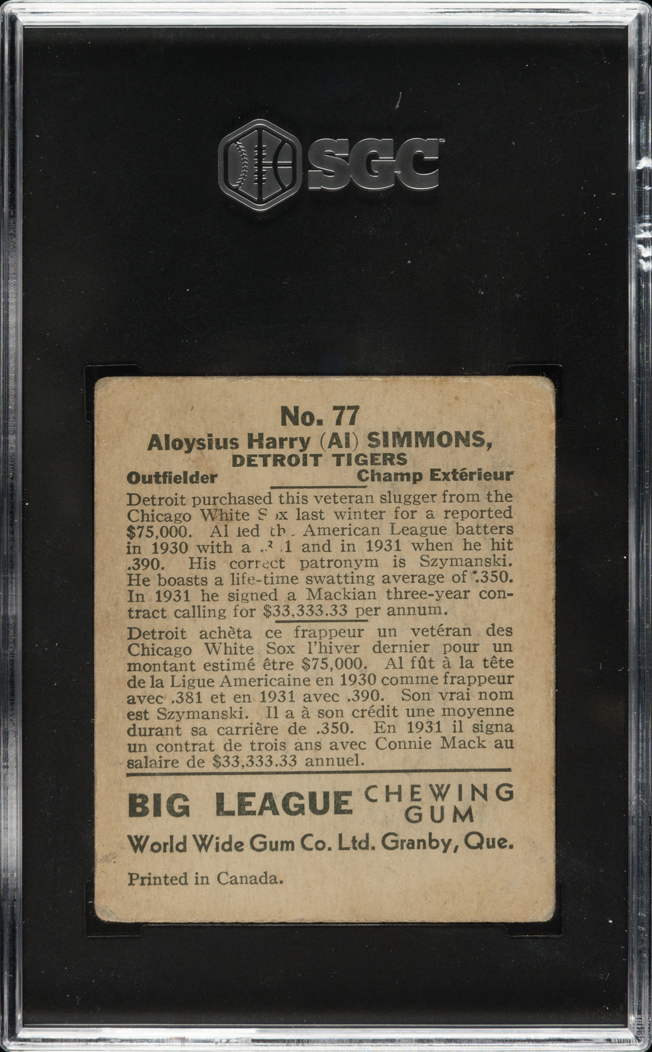Graded VG 3 by SGC. Detroit Tigers Hall of Famer Al Simmons.