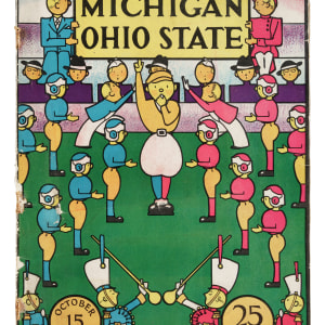 Program from the October 15, 1932 football matchup between rivals Ohio State and Michigan. The game, held at Ohio State, saw Michigan walk away with a 14-0 victory on their way to an undefeated season and National Championship victory. A star center and linebacker on the Michigan Wolverines was future United States President Gerald Ford. The program (7.75 x 10.5 inches) displays scattered creasing, a few small tears on the reverse cover, and oxidation to all three binding staples. In Good condition overall. The second page of the program features a composite image of seven Michigan players, including Gerald Ford, listed as a Center.