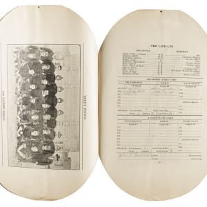 Program from the November 6, 1920 matchup between the Kansas Jayhawks and the Oklahoma Sooners football teams. Oklahoma would go on to win the game by a 21-9 margin on their way to a Missouri Valley Conference title. The Sooners, using a single-wing offensive scheme, were led by College Football Hall of Fame Coach, Bennie Owen and finished their title season with a 6-0-1 record. They outscored opponents by a combined total of 176 to 51. The football shaped program (7.75 x 11 inches), displays moderate handling wear, scattered creases, adhesive residue, and extra paper on the reverse, likely from previously being stored in an album.