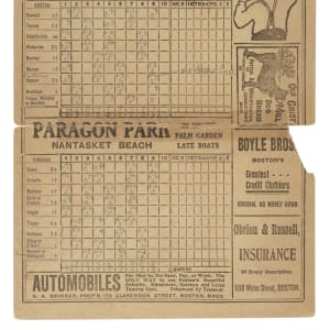 Fold-over scorecard issued for a game between the Chicago Cubs and the Boston Beaneaters. The preprinted lineups include Tinker, Chance, Schulte, and Lundgren (who has been crossed out in pencil with "Brown" written in) for Chicago, and Abbaticchio and Needham for Boston. Neatly scored in pencil to record a 4-3 Boston victory. Research indicates that this was the first game of a doubleheader that took place on May 10, 1905 at Boston's South End Grounds. The front and back covers feature an advertisement for New England's World Fair at Paragon Park. The Chicago cubs finished with a 92-61 record which landed them in third place in 1905, trailing the pennant winning New York Giants and the Pittsburgh Pirates. Interestingly, the Cubs would go on to win National League pennants in four of the next five seasons, and secure World Series victories in 1907 and 1908 before beginning their infamous 108-year drought. The scorecard (7.5 x 9.75 inches, unfolded) displays moderate handling wear, a few scattered creases, has been taped on both sides of the center-fold, and is missing a piece of paper from the "Boyle Bros." advertisement on the Chicago half of the scorecard. In Fair condition overall.