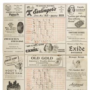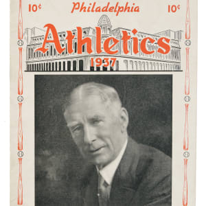 Philadelphia Athletics regular-season program issued for a game against the New York Yankees held at Shibe Park in 1937. The preprinted lineups include Moses, Johnson, and Hayes for Philadelphia, and Gehrig, DiMaggio, Dickey, Lazzeri, Ruffing, Hadley, Crosetti, and Rolfe for New York. Neatly scored for both games of a September 6th doubleheader in pencil (for the first game) and black ink (for the second game). The Athletics would fall to the Yankees in both games. A five-run fourth inning, capped-off by Joe DiMaggio's three-run homer off Buck Ross, would propel the Yankees, who took game one by a score of 6-3. Lou Gehrig played an instrumental role in game two with a fourth-inning RBI, which would tie the game, and a sixth-inning run, which would secure the Yankees 2-1 win. Ultimately, the Yankees would finish the season with a 102-52 record, winning their ninth pennant and beating their crosstown rival Giants in the World Series for their sixth championship title. The program (6.75 x 11 inches) displays scattered creasing and a few small spots of paper loss on the front cover. In Good condition overall.