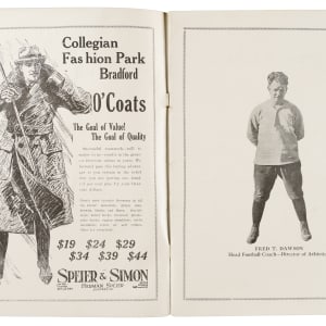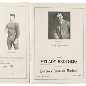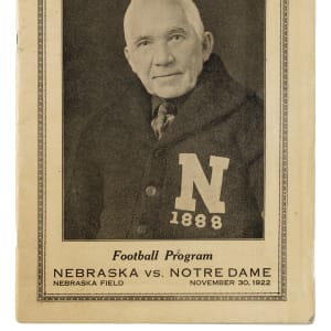 Program from the November 30, 1922 Thanksgiving Day game between the Nebraska Cornhuskers and the Notre Dame Fighting Irish played at Nebraska Field. The Cornhuskers, led by Coach Fred Dawson, handed Knute Rockne's Fighting Irish their only loss of the season in their final game, while clinching their second consecutive Missouri Valley Conference title. 1922 was the first season featuring Notre Dame's "Four Horseman" (Jim Crowley, Elmer Layden, Don Miller, and Harry Stuhldreher). The Nebraska win marked the first of only two losses through three seasons for the Four Horseman backfield of the Fighting Irish. Interestingly, their second loss came the following year in Nebraska before ultimately winning a National Title in 1924 while going undefeated. The thirty-six page program (8 x 10.75 inches) displays a few light creases near the spine, a small area of paper loss on the back cover, and a tear of the front cover from the spine on the lower portion of item. In Very Good to Excellent condition overall.