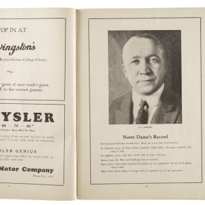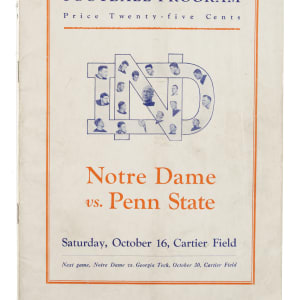 Program from the October 16, 1926 football matchup between legendary coach Knute Rockne's Notre Dame Fighting Irish and the Penn State Nittany Lions. The game, played at Cartier Field in South Bend, IN, saw Rockne's Fighting Irish win handedly by a score of 28-0. Notre Dame would go on to win all but one of their ten games, suffering an upset shutout loss to Carnegie Tech in Pittsburgh, PA on November 27th. The following week, in the final match of their season, the Irish would defeat the USC Trojans in their inaugural meeting, which sparked the storied rivalry. The seventy-two page program (7.75 x 10.5 inches) features many scattered moderate creases and light toning on the covers. In Very Good condition overall.