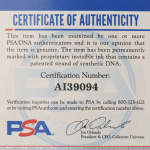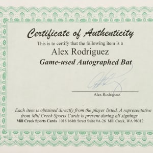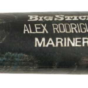 Alex Rodriguez Rawlings block-letter (full name) model ("460B") bat dating from the 1999 season. Rodriguez has personally attested to its game use by inscribing the barrel in silver paint pen: "Alex Rodriguez/99 Game Used." Also accompanied by a COA, issued by Mill Creek Sports, signed by Rodriguez. The bat, which is not cracked, displays heavy use along its entire length, including ball marks (with blue-ink transfers and white scuffs), ball-stitch impressions, checking (grain separation from repeated contact) on the back of the barrel, and pine tar on the upper handle. The model number ("460B"), the batch code ("666"), and the year code ("99") are all stamped on the knob. Rodriguez was in just his fourth full season with the Seattle Mariners in 1999, but he had already established himself as one of the top players in the game, as evidenced by his 42 home runs, 111 RBI, and .285 batting average that season. One of only nine players to hit over 600 home runs in his career, Rodriguez retired in 2016 with 696 home runs (fourth best all time), 2,086 RBI (fourth best all time) and a .295 lifetime average. Length: 34 inches. Weight: 30.3 ounces. LOA from Alex Rodriguez. Basic certification from PSA/DNA for the signature only. The size/weight of this item requires that there will be an additional shipping charge for this lot.