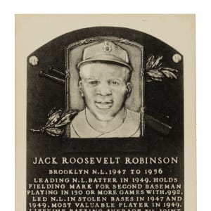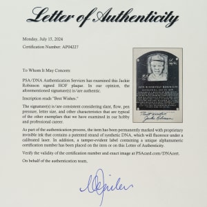 Brooklyn Dodgers Hall of Famer Jackie Robinson signed postcard. Full LOA from PSA/DNA. Full LOA from Steve Grad and Brian Sobrero/Beckett Authentication Services.
