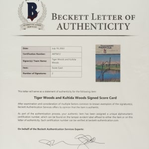 Golf Hall of Famer Tiger Woods and mom Kultida Woods signed score card. Total dimensions: 8-1/4 x 10-1/4 Inches. Full LOA from Steve Grad and Brian Sobrero/Beckett Authentication Services.