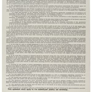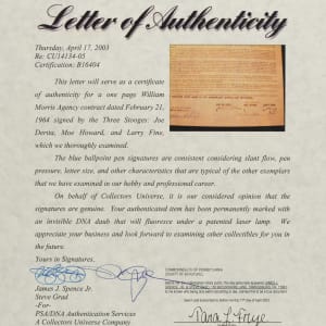 One-page contract between the William Morris Agency and The Three Stooges: Moe Howard, Larry Fine and Joe DeRita. The Stooges achieved their greatest earning power in the late 1950s and early 1960s, when their early movie shorts were shown continuously on TV. The exposure caused the Stooges to became a part of growing up for millions of new young fans, and launched a second career for the legendary comedy trio, both in movies and for personal appearances. The contract, dated February 21, 1964, appoints the William Morris Agency as the exclusive agent of The Three Stooges for a one-year period beginning on the date of signing. The contract also calls for the Agency to receive a 10% commission rate for its services. The contract has been signed by Moe Howard, Larry Fine and Joe DeRita, as well as by a representative of the agency. The contract (8.5 x 13 inches) displays two horizontal folds, notebook holes along the top, two sets of staple holes in the upper left corner, a crease in the lower portion of the document, and a small tear on the right edge near the bottom. In Excellent condition overall. A PSA/DNA certification sticker is affixed to the reverse. Full LOA from PSA/DNA.