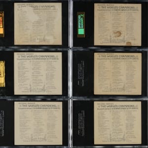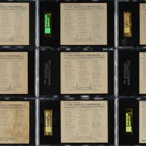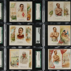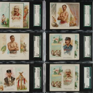 Complete set of the fifty cards comprising of the N43 Allen & Ginter "World's Champions" cards, including Hall of Famer Buck Ewing. The N43 series, the rarest of the three Allen & Ginter "Champions" sets, feature the same subjects and designs as the smaller N29 second series Allen & Ginters, but in a larger format and with extra background artwork added to each card's design. Measuring approximately 3 x 3.25 inches, the N43 Allen & Ginters are widely recognized as one of the most attractive sets ever issued. The set features champions and stars of the day from a variety of sports. This is a very crisp, clean, sharp-looking group of these rare cards, including six baseball players and eight boxers. All fifty cards have been graded and encapsulated by SGC. SGC Grading Composite: EX/NM 80 (8 cards): Carter, Crocker, Cummings, East, F. Murphy, Paulsen, Queckberner, and Rowe. EX+ 70 (2 cards): Bauer and Fitzgerald. EX 60 (13 cards): Bibby, Boyton, Duffy, Dwight, Harradon, Hill, Kerrigan, Myers, O'Conner, Page, Ray, Slocum Jr., and Stone. VG/EX 50 (14 cards): Barry, Clarke, Crist, Daly, Fogarty, George, Getzin, Ives, McCormack, G. Miller, Morrell, Ross, Spears, and Temple. VG 40 (7 cards): Albert, Ford, Havlin, Lange, J. Murphy, Webb, and Wood. GOOD 30 (5 cards): Ewing, La Blanche, McGee, Pettitt, and Ryan. FAIR 20 (1 card): Edwards. N43 Allen & Ginters is a very rare set to find complete or near-complete. Total: 50 cards.