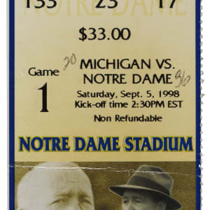 Michigan Wolverines ticket stub from a September 5, 1998 game against the Notre Dame Fighting Irish season opener where Tom Brady made his first career start. The Wolverines fell to the Fighting Irish 36-20. Brady threw for 267 yards and complete twenty three passes in the loss. Poor condition overall.