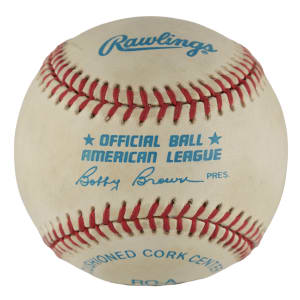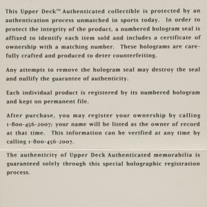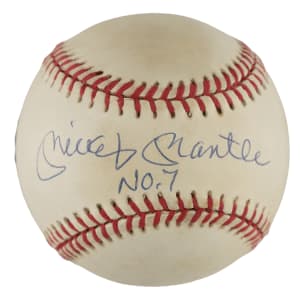 Official American League baseball (Brown) inscribed "Mickey Mantle No. 7" in blue ink on the sweet spot. Although Mantle signed thousands of baseballs during his years of retirement, those bearing additional notations are the exception rather than the rule. As such, they have always been held in higher regard by most collectors. The ball displays light toning throughout but is otherwise in Excellent condition overall. An Upper Deck certification sticker is affixed to the ball. Accompanied by an Upper Deck COA.