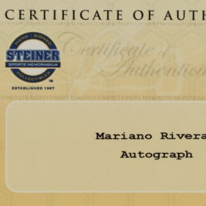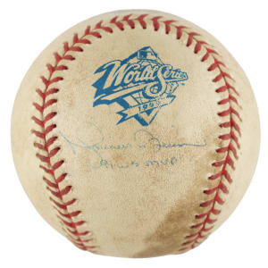 Game-used baseball from the 1999 World Series signed by New York Yankees Hall of Fame closer Mariano Rivera in blue ink. Rivera has inscribed the ball "Mariano Rivera/'99 WS MVP" on a side panel. Rivera recorded a win and two saves while delivering 4-2/3 scoreless innings against the Atlanta Braves during the 1999 World Series, earning him MVP honors. The ball displays wear commensurate with its game-used status. The ball is affixed with a Steiner certification sticker and is accompanied by a Steiner COA.